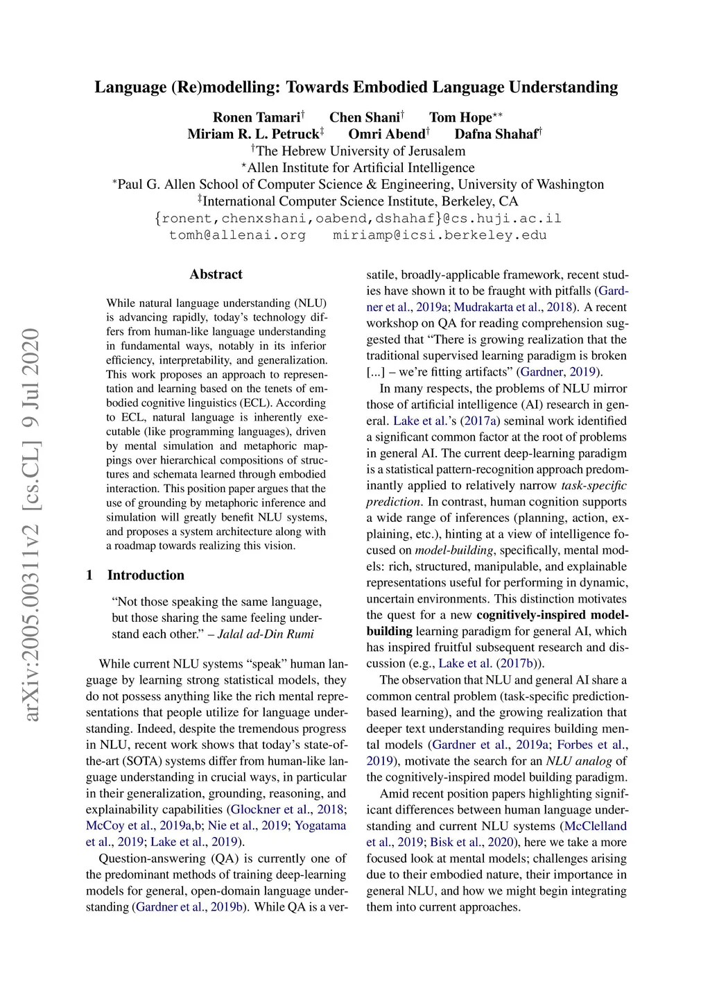 While natural language understanding (NLU) is advancing rapidly, today's technology differs from human-like language understanding in fundamental ways, notably in its inferior efficiency, interpretability, and generalization. This work proposes an approach to representation and learning based on the tenets of embodied cognitive linguistics (ECL). According to ECL, natural language is inherently executable (like programming languages), driven by mental simulation and metaphoric mappings over hierarchical compositions of structures and schemata learned through embodied interaction. This position paper argues that the use of grounding by metaphoric inference and simulation will greatly benefit NLU systems, and proposes a system architecture along with a roadmap towards realizing this vision.
