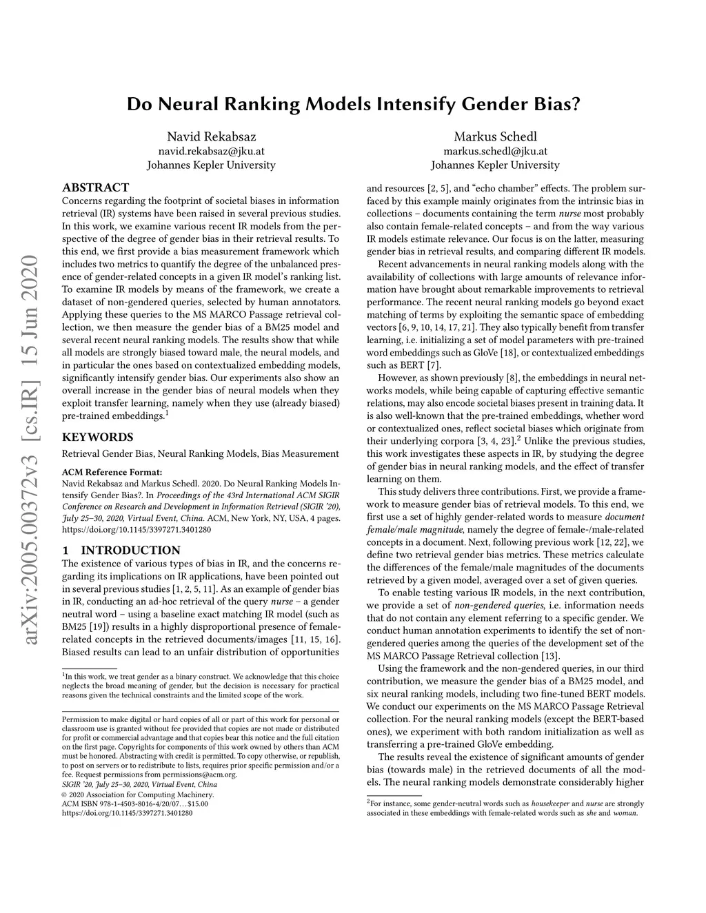 Concerns regarding the footprint of societal biases in information retrieval (IR) systems have been raised in several previous studies. In this work, we examine various recent IR models from the perspective of the degree of gender bias in their retrieval results. To this end, we first provide a bias measurement framework which includes two metrics to quantify the degree of the unbalanced presence of gender-related concepts in a given IR model's ranking list. To examine IR models by means of the framework, we create a dataset of non-gendered queries, selected by human annotators. Applying these queries to the MS MARCO Passage retrieval collection, we then measure the gender bias of a BM25 model and several recent neural ranking models. The results show that while all models are strongly biased toward male, the neural models, and in particular the ones based on contextualized embedding models, significantly intensify gender bias. Our experiments also show an overall increase in the gender bias of neural models when they exploit transfer learning, namely when they use (already biased) pre-trained embeddings.