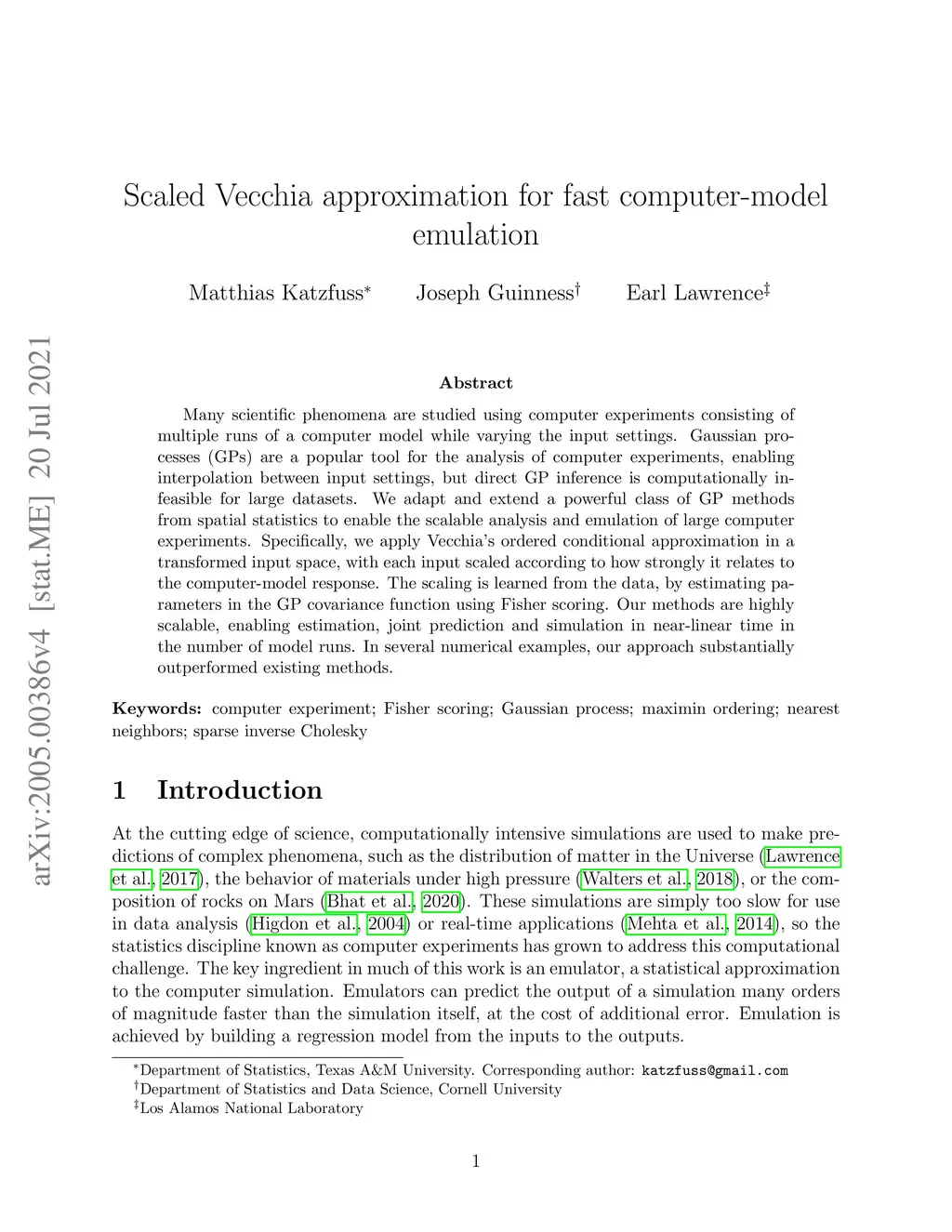 Many scientific phenomena are studied using computer experiments consisting of multiple runs of a computer model while varying the input settings. Gaussian processes (GPs) are a popular tool for the analysis of computer experiments, enabling interpolation between input settings, but direct GP inference is computationally infeasible for large datasets. We adapt and extend a powerful class of GP methods from spatial statistics to enable the scalable analysis and emulation of large computer experiments. Specifically, we apply Vecchia's ordered conditional approximation in a transformed input space, with each input scaled according to how strongly it relates to the computer-model response. The scaling is learned from the data, by estimating parameters in the GP covariance function using Fisher scoring. Our methods are highly scalable, enabling estimation, joint prediction and simulation in near-linear time in the number of model runs. In several numerical examples, our approach substantially outperformed existing methods.