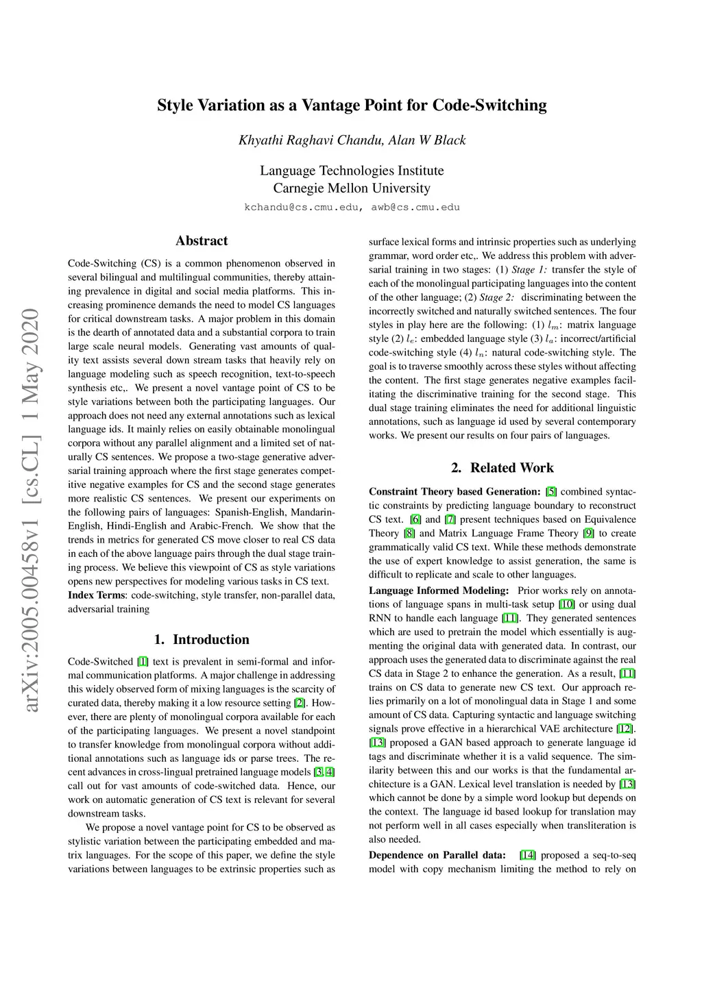 Code-Switching (CS) is a common phenomenon observed in several bilingual and multilingual communities, thereby attaining prevalence in digital and social media platforms. This increasing prominence demands the need to model CS languages for critical downstream tasks. A major problem in this domain is the dearth of annotated data and a substantial corpora to train large scale neural models. Generating vast amounts of quality text assists several down stream tasks that heavily rely on language modeling such as speech recognition, text-to-speech synthesis etc,. We present a novel vantage point of CS to be style variations between both the participating languages. Our approach does not need any external annotations such as lexical language ids. It mainly relies on easily obtainable monolingual corpora without any parallel alignment and a limited set of naturally CS sentences. We propose a two-stage generative adversarial training approach where the first stage generates competitive negative examples for CS and the second stage generates more realistic CS sentences. We present our experiments on the following pairs of languages: Spanish-English, Mandarin-English, Hindi-English and Arabic-French. We show that the trends in metrics for generated CS move closer to real CS data in each of the above language pairs through the dual stage training process. We believe this viewpoint of CS as style variations opens new perspectives for modeling various tasks in CS text.