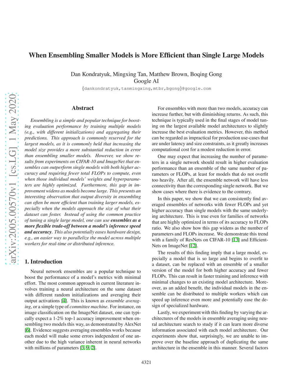 Ensembling is a simple and popular technique for boosting evaluation performance by training multiple models (e.g., with different initializations) and aggregating their predictions. This approach is commonly reserved for the largest models, as it is commonly held that increasing the model size provides a more substantial reduction in error than ensembling smaller models. However, we show results from experiments on CIFAR-10 and ImageNet that ensembles can outperform single models with both higher accuracy and requiring fewer total FLOPs to compute, even when those individual models' weights and hyperparameters are highly optimized. Furthermore, this gap in improvement widens as models become large. This presents an interesting observation that output diversity in ensembling can often be more efficient than training larger models, especially when the models approach the size of what their dataset can foster. Instead of using the common practice of tuning a single large model, one can use ensembles as a more flexible trade-off between a model's inference speed and accuracy. This also potentially eases hardware design, e.g., an easier way to parallelize the model across multiple workers for real-time or distributed inference.