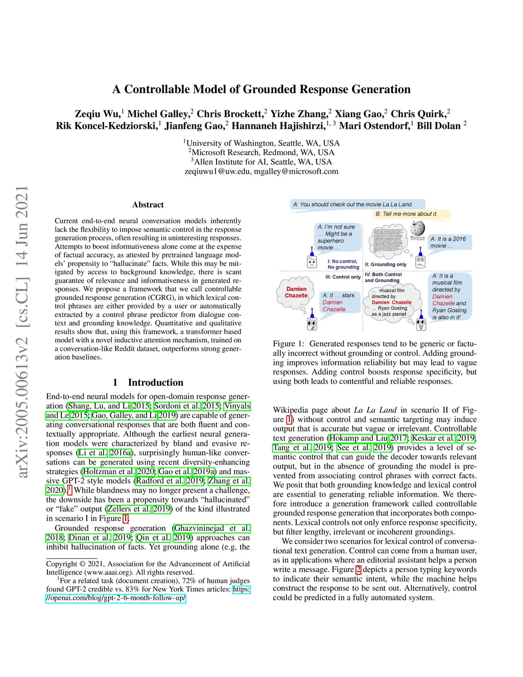 Current end-to-end neural conversation models inherently lack the flexibility to impose semantic control in the response generation process, often resulting in uninteresting responses. Attempts to boost informativeness alone come at the expense of factual accuracy, as attested by pretrained language models' propensity to "hallucinate" facts. While this may be mitigated by access to background knowledge, there is scant guarantee of relevance and informativeness in generated responses. We propose a framework that we call controllable grounded response generation (CGRG), in which lexical control phrases are either provided by a user or automatically extracted by a control phrase predictor from dialogue context and grounding knowledge. Quantitative and qualitative results show that, using this framework, a transformer based model with a novel inductive attention mechanism, trained on a conversation-like Reddit dataset, outperforms strong generation baselines.