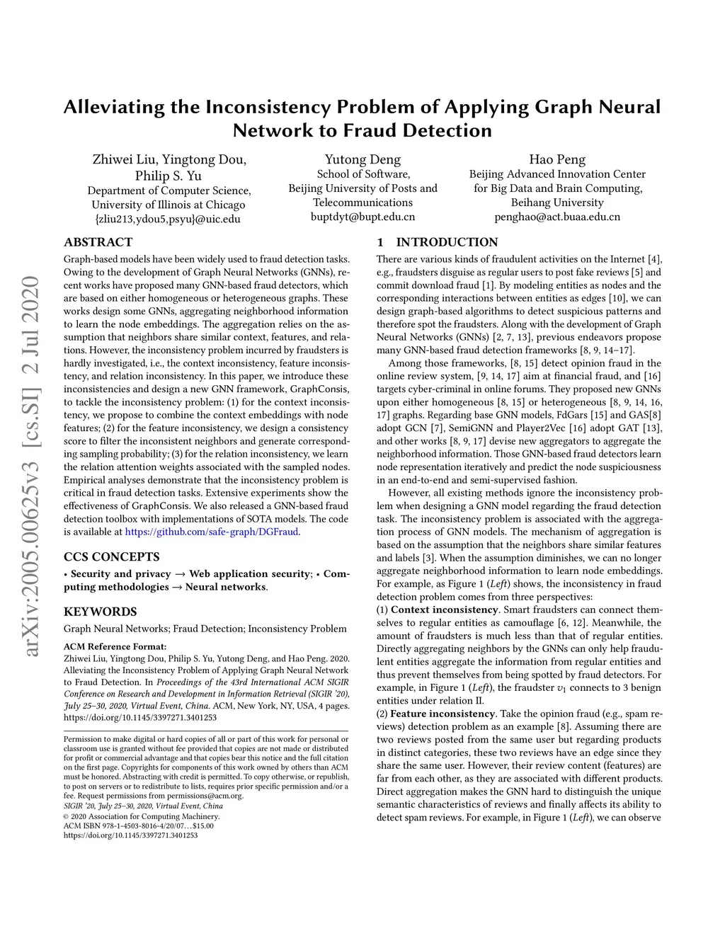 The graph-based model can help to detect suspicious fraud online. Owing to the development of Graph Neural Networks~(GNNs), prior research work has proposed many GNN-based fraud detection frameworks based on either homogeneous graphs or heterogeneous graphs. These work follow the existing GNN framework by aggregating the neighboring information to learn the node embedding, which lays on the assumption that the neighbors share similar context, features, and relations. However, the inconsistency problem is hardly investigated, i.e., the context inconsistency, feature inconsistency, and relation inconsistency. In this paper, we introduce these inconsistencies and design a new GNN framework, , to tackle the inconsistency problem: (1) for the context inconsistency, we propose to combine the context embeddings with node features, (2) for the feature inconsistency, we design a consistency score to filter the inconsistent neighbors and generate corresponding sampling probability, and (3) for the relation inconsistency, we learn a relation attention weights associated with the sampled nodes. Empirical analysis on four datasets indicates the inconsistency problem is crucial in a fraud detection task. The extensive experiments prove the effectiveness of . We also released a GNN-based fraud detection toolbox with implementations of SOTA models. The code is available at https://github.com/safe-graph/DGFraud.