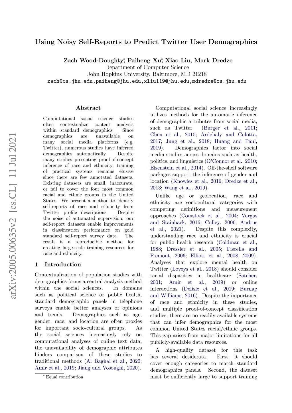 Computational social science studies often contextualize content analysis within standard demographics. Since demographics are unavailable on many social media platforms (e.g. Twitter) numerous studies have inferred demographics automatically. Despite many studies presenting proof of concept inference of race and ethnicity, training of practical systems remains elusive since there are few annotated datasets. Existing datasets are small, inaccurate, or fail to cover the four most common racial and ethnic groups in the United States. We present a method to identify self-reports of race and ethnicity from Twitter profile descriptions. Despite errors inherent in automated supervision, we produce models with good performance when measured on gold standard self-report survey data. The result is a reproducible method for creating large-scale training resources for race and ethnicity.