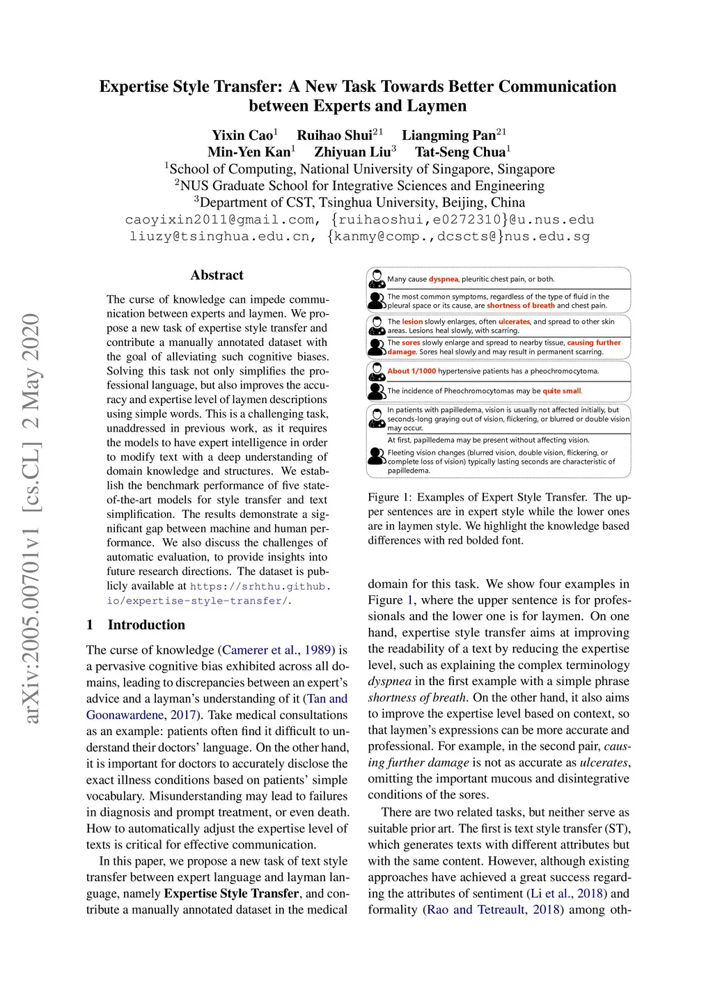 The curse of knowledge can impede communication between experts and laymen. We propose a new task of expertise style transfer and contribute a manually annotated dataset with the goal of alleviating such cognitive biases. Solving this task not only simplifies the professional language, but also improves the accuracy and expertise level of laymen descriptions using simple words. This is a challenging task, unaddressed in previous work, as it requires the models to have expert intelligence in order to modify text with a deep understanding of domain knowledge and structures. We establish the benchmark performance of five state-of-the-art models for style transfer and text simplification. The results demonstrate a significant gap between machine and human performance. We also discuss the challenges of automatic evaluation, to provide insights into future research directions. The dataset is publicly available at https://srhthu.github.io/expertise-style-transfer.