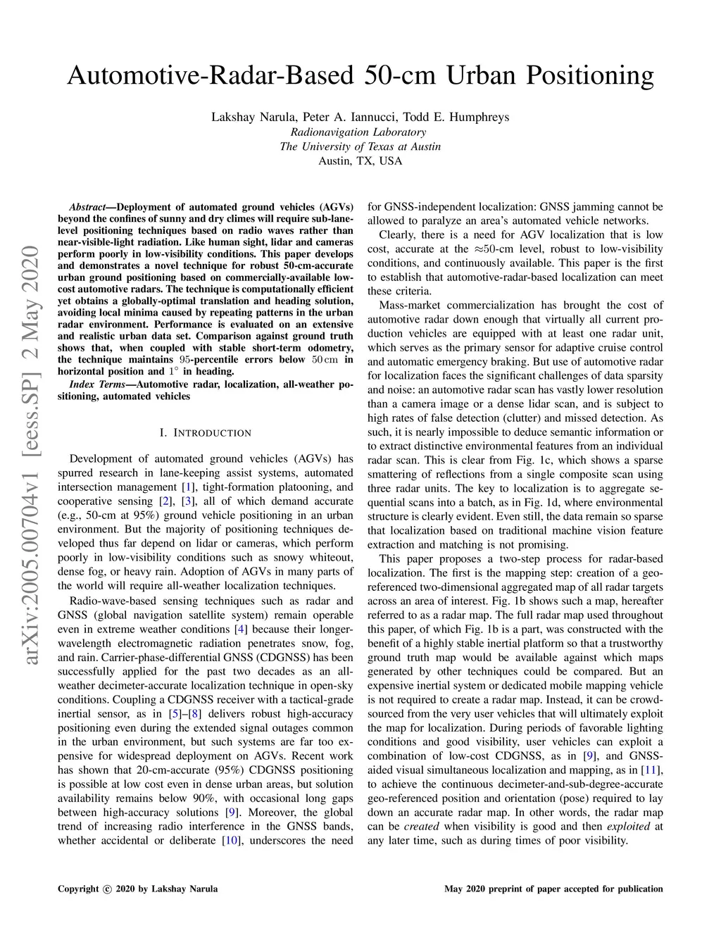 Deployment of automated ground vehicles (AGVs) beyond the confines of sunny and dry climes will require sub-lane-level positioning techniques based on radio waves rather than near-visible-light radiation. Like human sight, lidar and cameras perform poorly in low-visibility conditions. This paper develops and demonstrates a novel technique for robust 50-cm-accurate urban ground positioning based on commercially-available low-cost automotive radars. The technique is computationally efficient yet obtains a globally-optimal translation and heading solution, avoiding local minima caused by repeating patterns in the urban radar environment. Performance is evaluated on an extensive and realistic urban data set. Comparison against ground truth shows that, when coupled with stable short-term odometry, the technique maintains 95-percentile errors below 50 cm in horizontal position and 1 degree in heading.