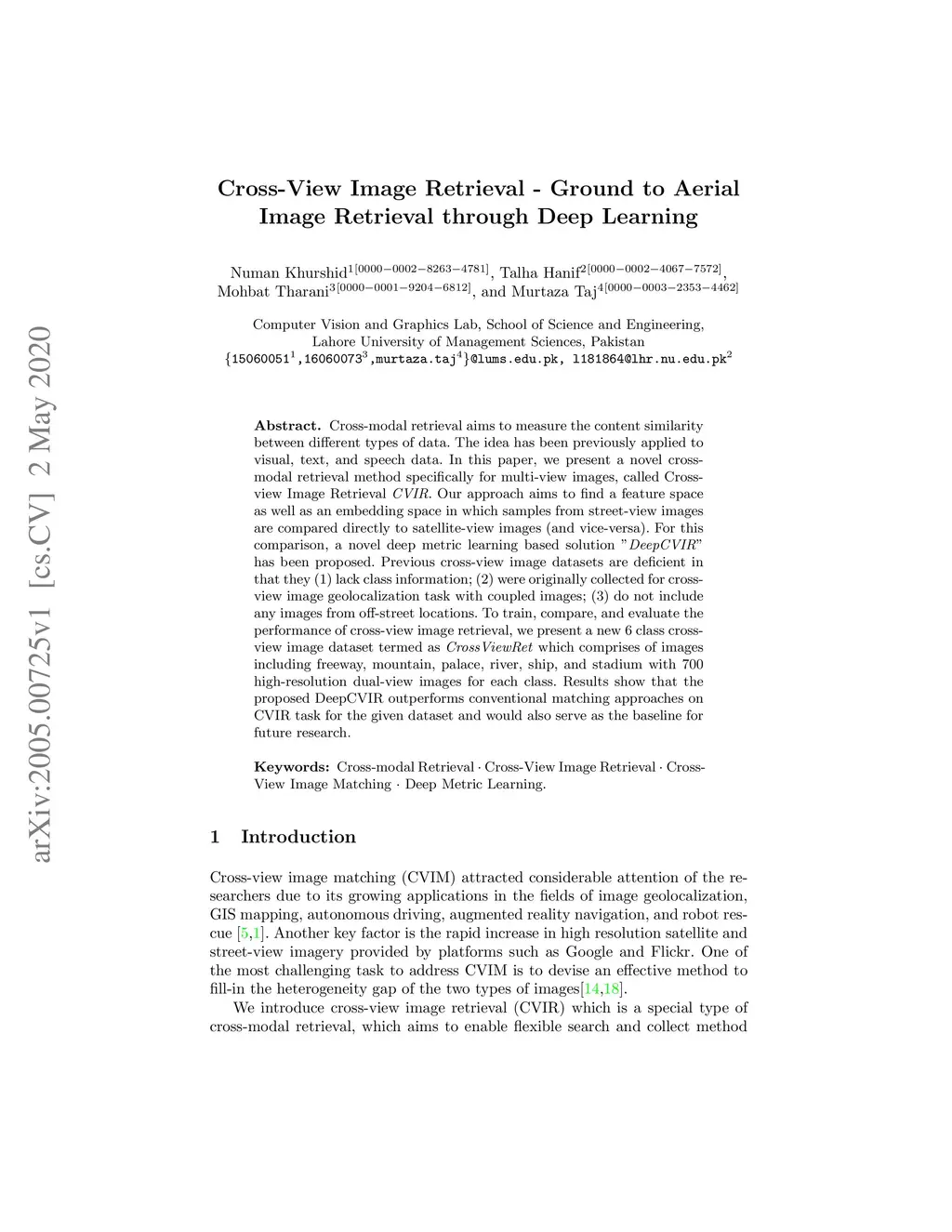 Cross-modal retrieval aims to measure the content similarity between different types of data. The idea has been previously applied to visual, text, and speech data. In this paper, we present a novel cross-modal retrieval method specifically for multi-view images, called Cross-view Image Retrieval CVIR. Our approach aims to find a feature space as well as an embedding space in which samples from street-view images are compared directly to satellite-view images (and vice-versa). For this comparison, a novel deep metric learning based solution "DeepCVIR" has been proposed. Previous cross-view image datasets are deficient in that they (1) lack class information; (2) were originally collected for cross-view image geolocalization task with coupled images; (3) do not include any images from off-street locations. To train, compare, and evaluate the performance of cross-view image retrieval, we present a new 6 class cross-view image dataset termed as CrossViewRet which comprises of images including freeway, mountain, palace, river, ship, and stadium with 700 high-resolution dual-view images for each class. Results show that the proposed DeepCVIR outperforms conventional matching approaches on the CVIR task for the given dataset and would also serve as the baseline for future research.