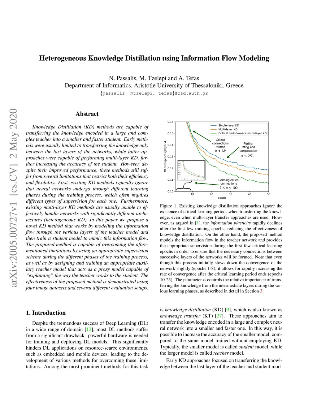 Knowledge Distillation (KD) methods are capable of transferring the knowledge encoded in a large and complex teacher into a smaller and faster student. Early methods were usually limited to transferring the knowledge only between the last layers of the networks, while latter approaches were capable of performing multi-layer KD, further increasing the accuracy of the student. However, despite their improved performance, these methods still suffer from several limitations that restrict both their efficiency and flexibility. First, existing KD methods typically ignore that neural networks undergo through different learning phases during the training process, which often requires different types of supervision for each one. Furthermore, existing multi-layer KD methods are usually unable to effectively handle networks with significantly different architectures (heterogeneous KD). In this paper we propose a novel KD method that works by modeling the information flow through the various layers of the teacher model and then train a student model to mimic this information flow. The proposed method is capable of overcoming the aforementioned limitations by using an appropriate supervision scheme during the different phases of the training process, as well as by designing and training an appropriate auxiliary teacher model that acts as a proxy model capable of "explaining" the way the teacher works to the student. The effectiveness of the proposed method is demonstrated using four image datasets and several different evaluation setups.