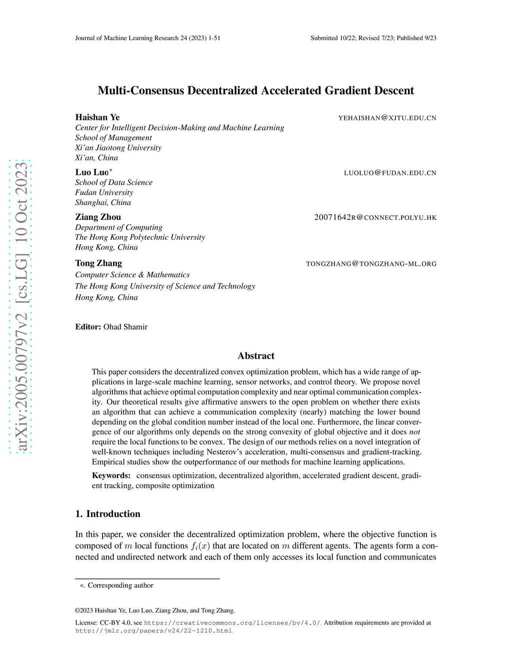 This paper considers the decentralized convex optimization problem, which has a wide range of applications in large-scale machine learning, sensor networks, and control theory. We propose novel algorithms that achieve optimal computation complexity and near optimal communication complexity. Our theoretical results give affirmative answers to the open problem on whether there exists an algorithm that can achieve a communication complexity (nearly) matching the lower bound depending on the global condition number instead of the local one. Furthermore, the linear convergence of our algorithms only depends on the strong convexity of global objective and it does \emph{not} require the local functions to be convex. The design of our methods relies on a novel integration of well-known techniques including Nesterov's acceleration, multi-consensus and gradient-tracking. Empirical studies show the outperformance of our methods for machine learning applications.