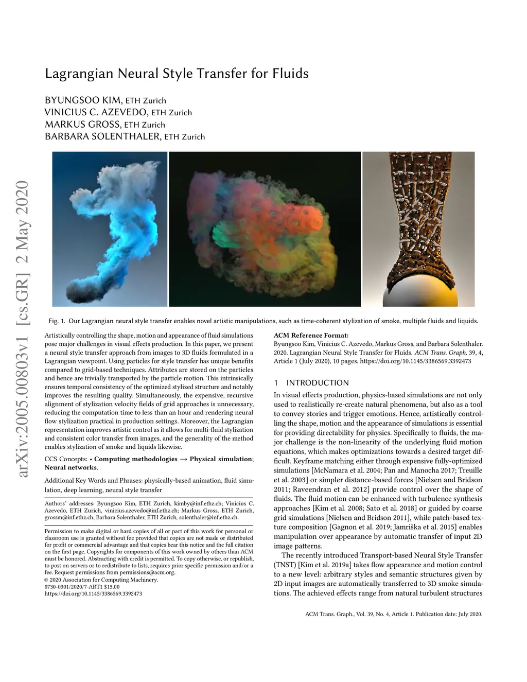 Artistically controlling the shape, motion and appearance of fluid simulations pose major challenges in visual effects production. In this paper, we present a neural style transfer approach from images to 3D fluids formulated in a Lagrangian viewpoint. Using particles for style transfer has unique benefits compared to grid-based techniques. Attributes are stored on the particles and hence are trivially transported by the particle motion. This intrinsically ensures temporal consistency of the optimized stylized structure and notably improves the resulting quality. Simultaneously, the expensive, recursive alignment of stylization velocity fields of grid approaches is unnecessary, reducing the computation time to less than an hour and rendering neural flow stylization practical in production settings. Moreover, the Lagrangian representation improves artistic control as it allows for multi-fluid stylization and consistent color transfer from images, and the generality of the method enables stylization of smoke and liquids likewise.