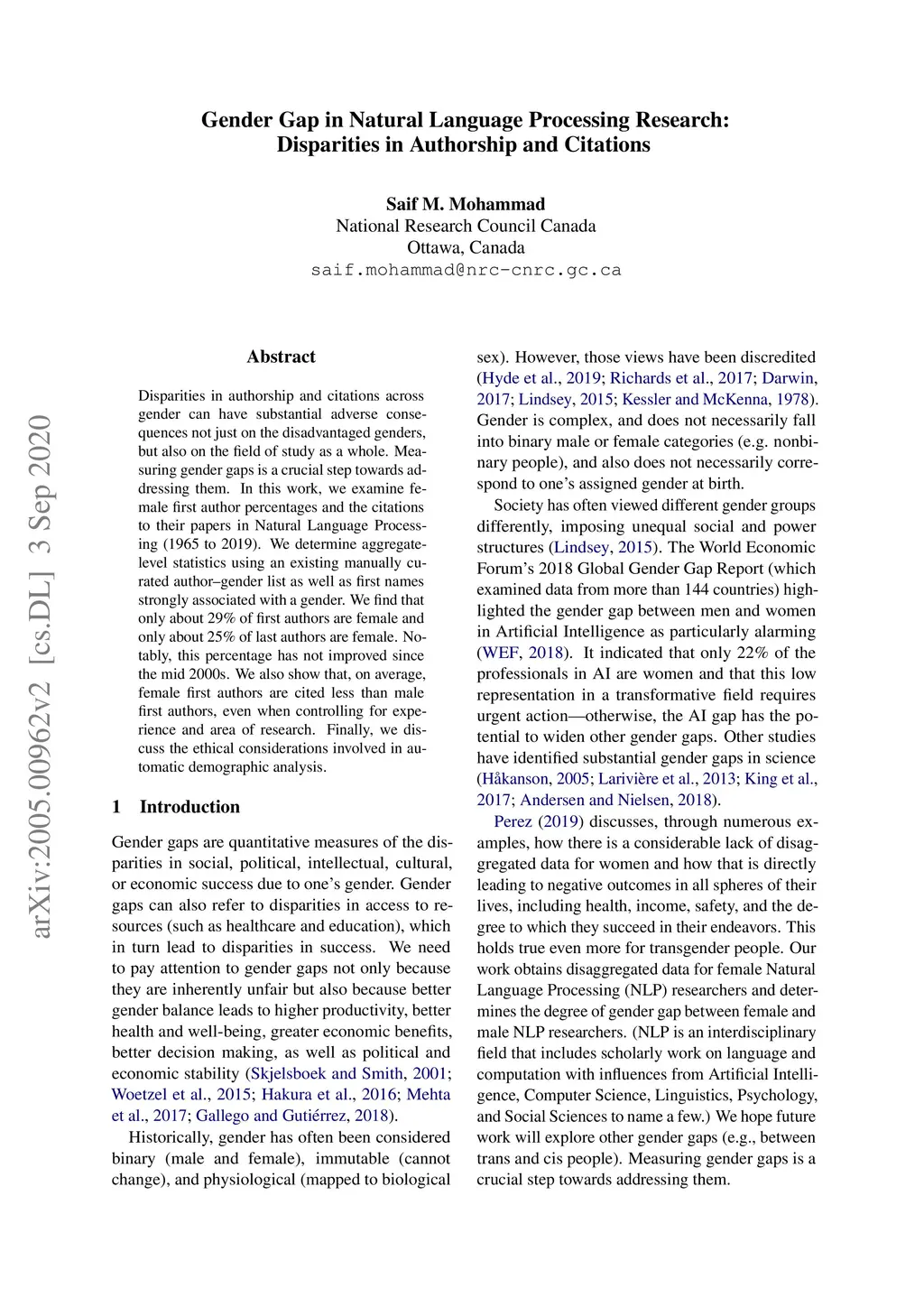 Disparities in authorship and citations across gender can have substantial adverse consequences not just on the disadvantaged genders, but also on the field of study as a whole. Measuring gender gaps is a crucial step towards addressing them. In this work, we examine female first author percentages and the citations to their papers in Natural Language Processing (1965 to 2019). We determine aggregate-level statistics using an existing manually curated author--gender list as well as first names strongly associated with a gender. We find that only about 29% of first authors are female and only about 25% of last authors are female. Notably, this percentage has not improved since the mid 2000s. We also show that, on average, female first authors are cited less than male first authors, even when controlling for experience and area of research. Finally, we discuss the ethical considerations involved in automatic demographic analysis.