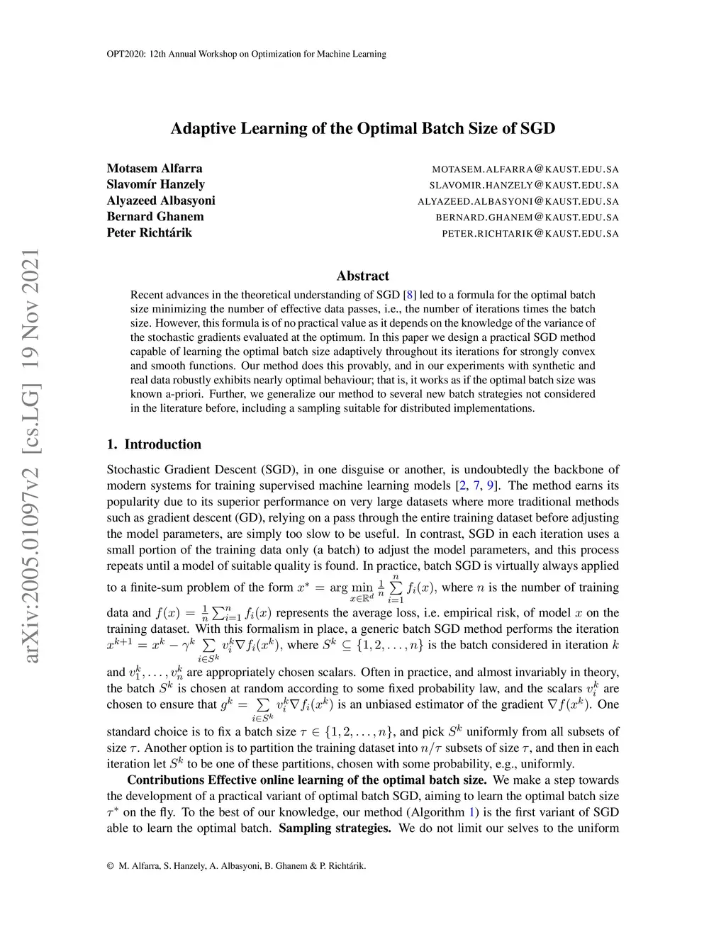 Recent advances in the theoretical understanding of SGD led to a formula for the optimal batch size minimizing the number of effective data passes, i.e., the number of iterations times the batch size. However, this formula is of no practical value as it depends on the knowledge of the variance of the stochastic gradients evaluated at the optimum. In this paper we design a practical SGD method capable of learning the optimal batch size adaptively throughout its iterations for strongly convex and smooth functions. Our method does this provably, and in our experiments with synthetic and real data robustly exhibits nearly optimal behaviour; that is, it works as if the optimal batch size was known a-priori. Further, we generalize our method to several new batch strategies not considered in the literature before, including a sampling suitable for distributed implementations.