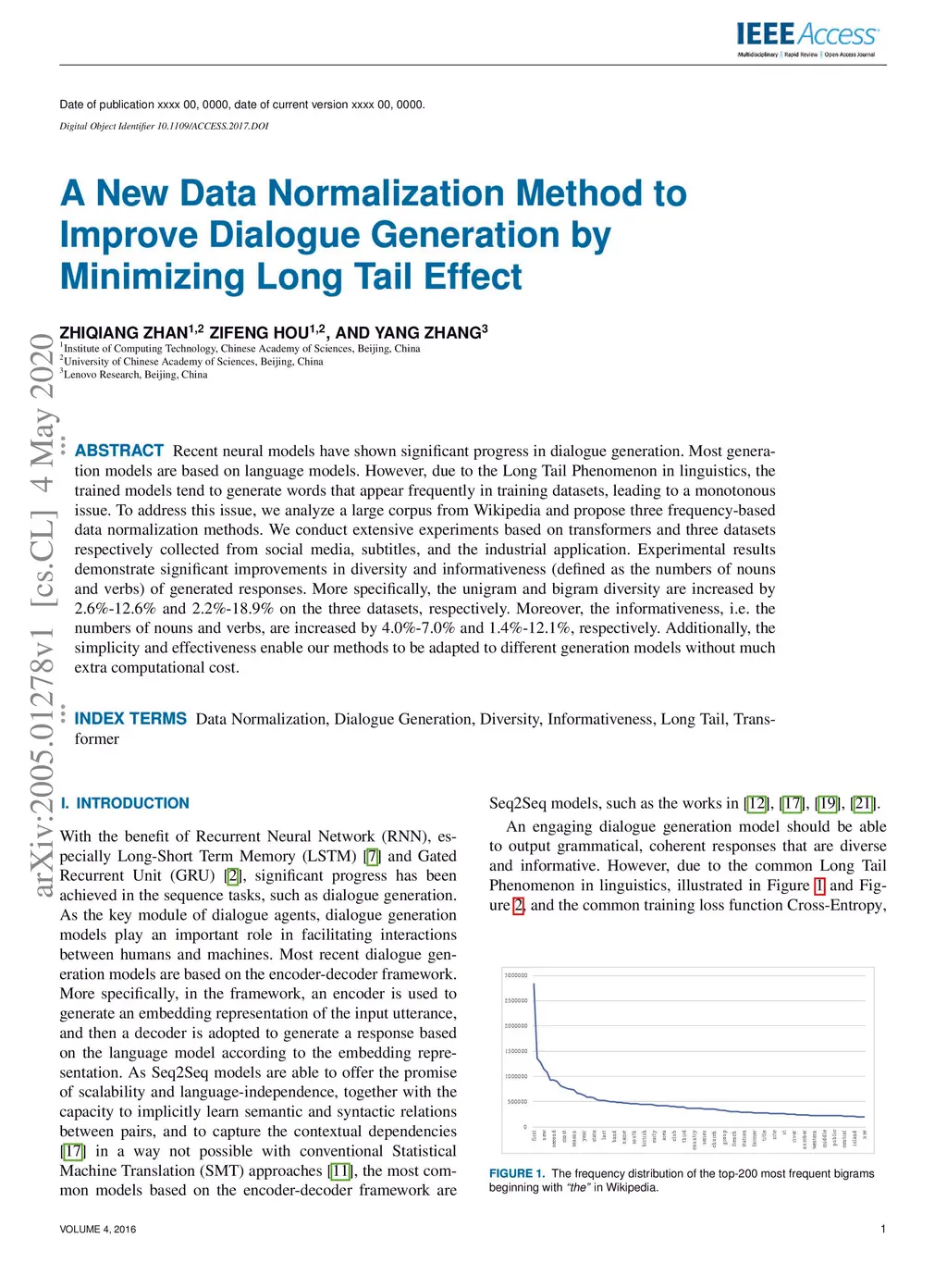 Recent neural models have shown significant progress in dialogue generation. Most generation models are based on language models. However, due to the Long Tail Phenomenon in linguistics, the trained models tend to generate words that appear frequently in training datasets, leading to a monotonous issue. To address this issue, we analyze a large corpus from Wikipedia and propose three frequency-based data normalization methods. We conduct extensive experiments based on transformers and three datasets respectively collected from social media, subtitles, and the industrial application. Experimental results demonstrate significant improvements in diversity and informativeness (defined as the numbers of nouns and verbs) of generated responses. More specifically, the unigram and bigram diversity are increased by 2.6%-12.6% and 2.2%-18.9% on the three datasets, respectively. Moreover, the informativeness, i.e. the numbers of nouns and verbs, are increased by 4.0%-7.0% and 1.4%-12.1%, respectively. Additionally, the simplicity and effectiveness enable our methods to be adapted to different generation models without much extra computational cost.