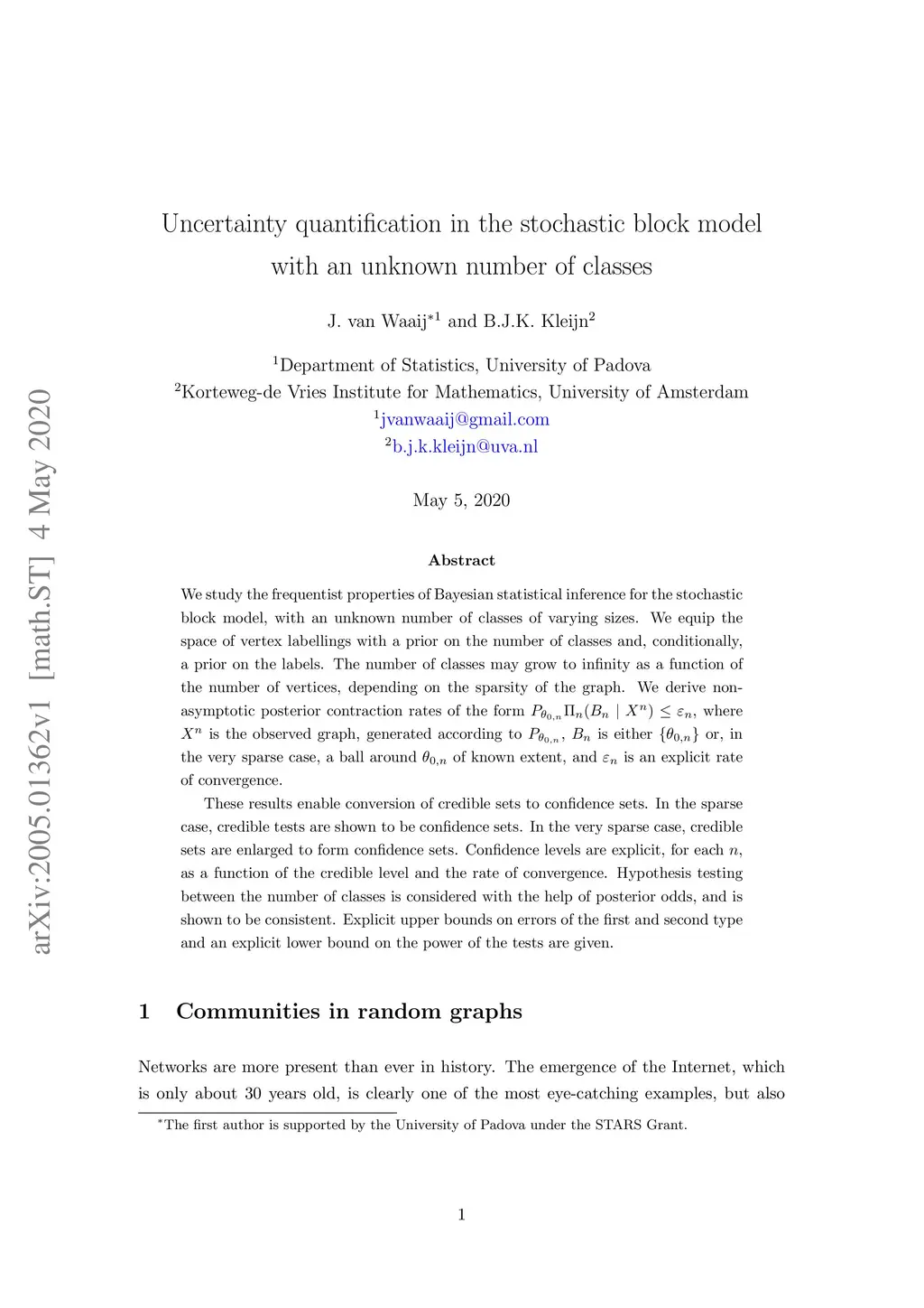 We study the frequentist properties of Bayesian statistical inference for the stochastic block model, with an unknown number of classes of varying sizes. We equip the space of vertex labellings with a prior on the number of classes and, conditionally, a prior on the labels. The number of classes may grow to infinity as a function of the number of vertices, depending on the sparsity of the graph. We derive non-asymptotic posterior contraction rates of the form , where is the observed graph, generated according to , is either or, in the very sparse case, a ball around of known extent, and is an explicit rate of convergence. These results enable conversion of credible sets to confidence sets. In the sparse case, credible tests are shown to be confidence sets. In the very sparse case, credible sets are enlarged to form confidence sets. Confidence levels are explicit, for each , as a function of the credible level and the rate of convergence. Hypothesis testing between the number of classes is considered with the help of posterior odds, and is shown to be consistent. Explicit upper bounds on errors of the first and second type and an explicit lower bound on the power of the tests are given.