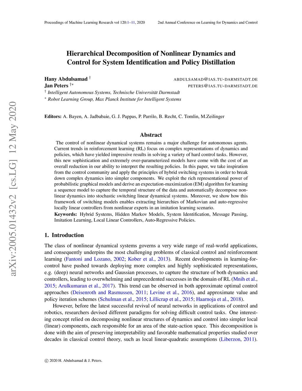 The control of nonlinear dynamical systems remains a major challenge for autonomous agents. Current trends in reinforcement learning (RL) focus on complex representations of dynamics and policies, which have yielded impressive results in solving a variety of hard control tasks. However, this new sophistication and extremely over-parameterized models have come with the cost of an overall reduction in our ability to interpret the resulting policies. In this paper, we take inspiration from the control community and apply the principles of hybrid switching systems in order to break down complex dynamics into simpler components. We exploit the rich representational power of probabilistic graphical models and derive an expectation-maximization (EM) algorithm for learning a sequence model to capture the temporal structure of the data and automatically decompose nonlinear dynamics into stochastic switching linear dynamical systems. Moreover, we show how this framework of switching models enables extracting hierarchies of Markovian and auto-regressive locally linear controllers from nonlinear experts in an imitation learning scenario.