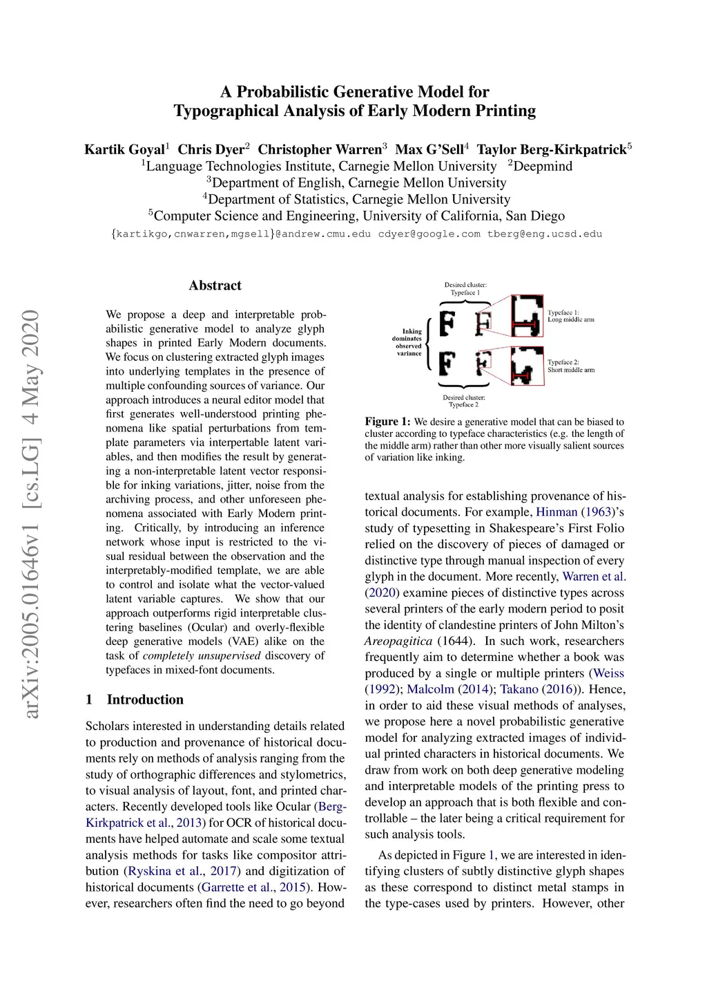We propose a deep and interpretable probabilistic generative model to analyze glyph shapes in printed Early Modern documents. We focus on clustering extracted glyph images into underlying templates in the presence of multiple confounding sources of variance. Our approach introduces a neural editor model that first generates well-understood printing phenomena like spatial perturbations from template parameters via interpertable latent variables, and then modifies the result by generating a non-interpretable latent vector responsible for inking variations, jitter, noise from the archiving process, and other unforeseen phenomena associated with Early Modern printing. Critically, by introducing an inference network whose input is restricted to the visual residual between the observation and the interpretably-modified template, we are able to control and isolate what the vector-valued latent variable captures. We show that our approach outperforms rigid interpretable clustering baselines (Ocular) and overly-flexible deep generative models (VAE) alike on the task of completely unsupervised discovery of typefaces in mixed-font documents.