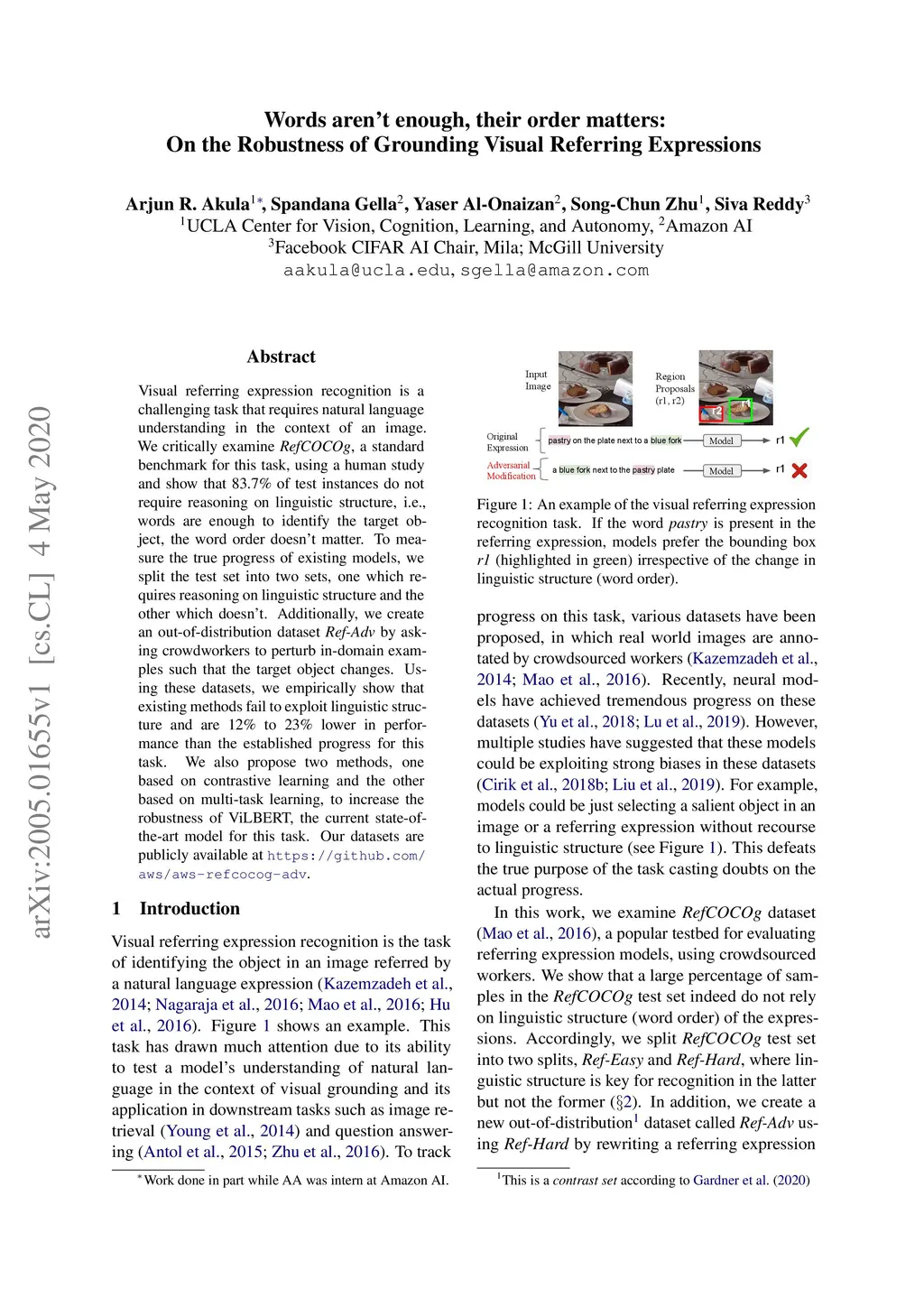 Visual referring expression recognition is a challenging task that requires natural language understanding in the context of an image. We critically examine RefCOCOg, a standard benchmark for this task, using a human study and show that 83.7% of test instances do not require reasoning on linguistic structure, i.e., words are enough to identify the target object, the word order doesn't matter. To measure the true progress of existing models, we split the test set into two sets, one which requires reasoning on linguistic structure and the other which doesn't. Additionally, we create an out-of-distribution dataset Ref-Adv by asking crowdworkers to perturb in-domain examples such that the target object changes. Using these datasets, we empirically show that existing methods fail to exploit linguistic structure and are 12% to 23% lower in performance than the established progress for this task. We also propose two methods, one based on contrastive learning and the other based on multi-task learning, to increase the robustness of ViLBERT, the current state-of-the-art model for this task. Our datasets are publicly available at https://github.com/aws/aws-refcocog-adv