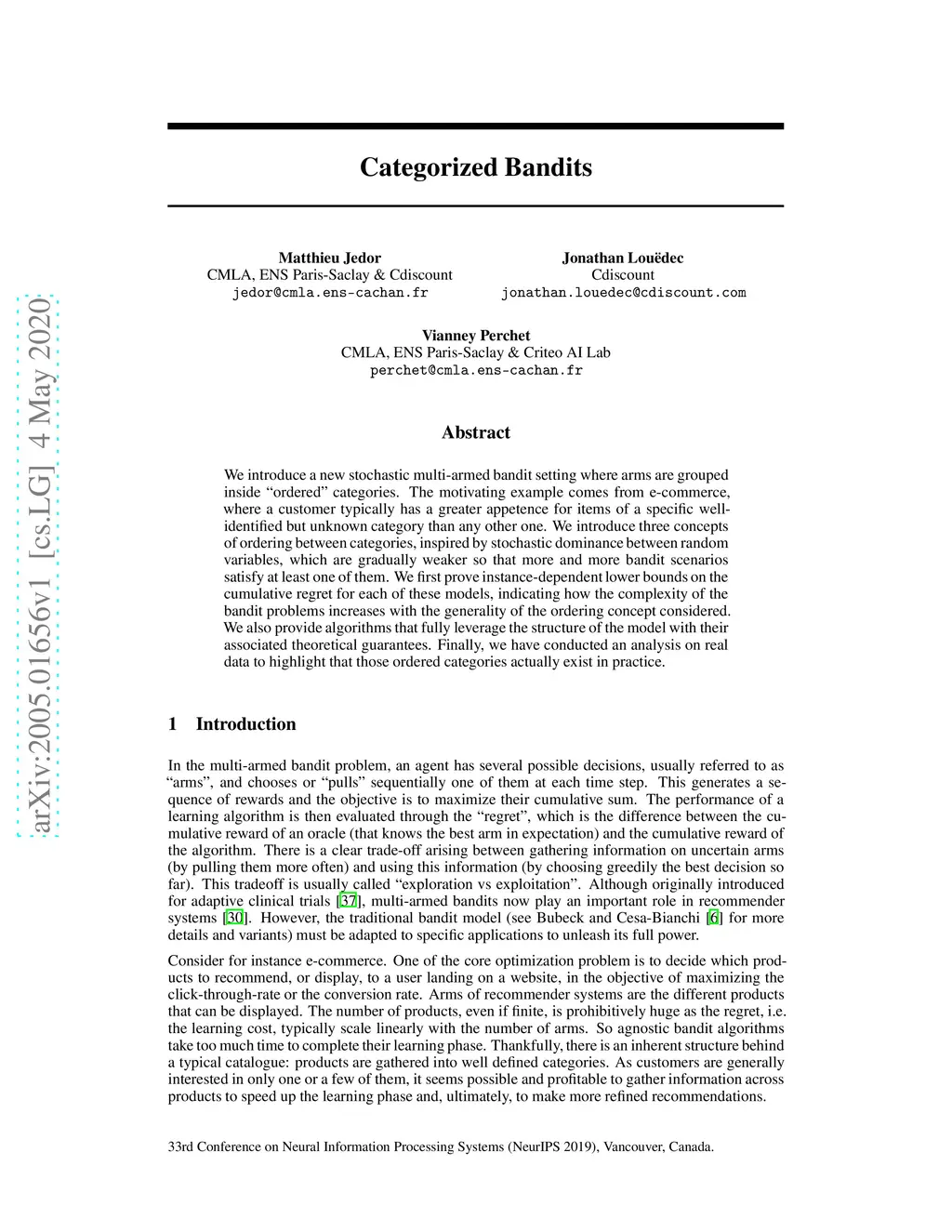 We introduce a new stochastic multi-armed bandit setting where arms are grouped inside ``ordered'' categories. The motivating example comes from e-commerce, where a customer typically has a greater appetence for items of a specific well-identified but unknown category than any other one. We introduce three concepts of ordering between categories, inspired by stochastic dominance between random variables, which are gradually weaker so that more and more bandit scenarios satisfy at least one of them. We first prove instance-dependent lower bounds on the cumulative regret for each of these models, indicating how the complexity of the bandit problems increases with the generality of the ordering concept considered. We also provide algorithms that fully leverage the structure of the model with their associated theoretical guarantees. Finally, we have conducted an analysis on real data to highlight that those ordered categories actually exist in practice.