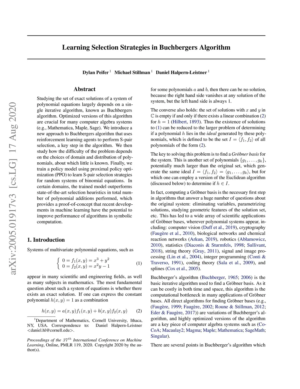 Studying the set of exact solutions of a system of polynomial equations largely depends on a single iterative algorithm, known as Buchberger's algorithm. Optimized versions of this algorithm are crucial for many computer algebra systems (e.g., Mathematica, Maple, Sage). We introduce a new approach to Buchberger's algorithm that uses reinforcement learning agents to perform S-pair selection, a key step in the algorithm. We then study how the difficulty of the problem depends on the choices of domain and distribution of polynomials, about which little is known. Finally, we train a policy model using proximal policy optimization (PPO) to learn S-pair selection strategies for random systems of binomial equations. In certain domains, the trained model outperforms state-of-the-art selection heuristics in total number of polynomial additions performed, which provides a proof-of-concept that recent developments in machine learning have the potential to improve performance of algorithms in symbolic computation.