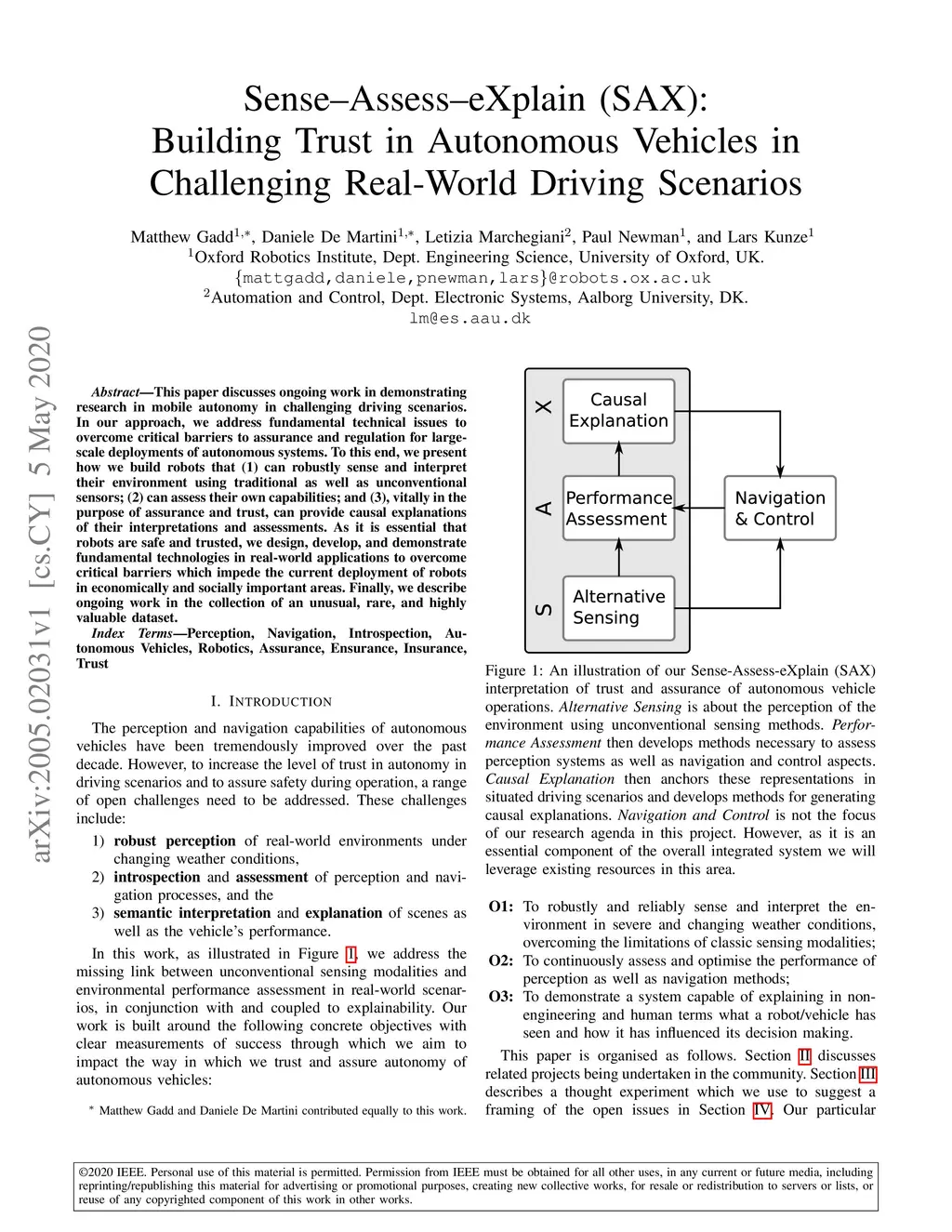 Sense-Assess-eXplain (SAX): Building Trust in Autonomous Vehicles in