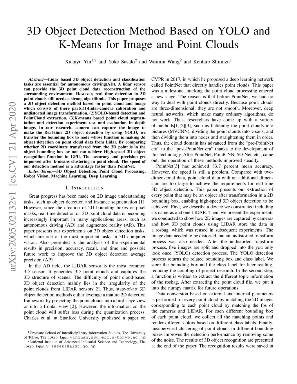 3D Object Detection Method Based on YOLO and K-Means for Image and Point