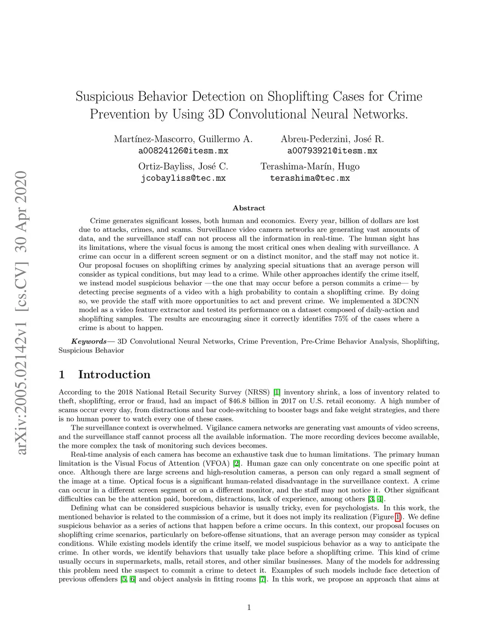 Crime generates significant losses, both human and economic. Every year, billions of dollars are lost due to attacks, crimes, and scams. Surveillance video camera networks are generating vast amounts of data, and the surveillance staff can not process all the information in real-time. The human sight has its limitations, where the visual focus is among the most critical ones when dealing with surveillance. A crime can occur in a different screen segment or on a distinct monitor, and the staff may not notice it. Our proposal focuses on shoplifting crimes by analyzing special situations that an average person will consider as typical conditions, but may lead to a crime. While other approaches identify the crime itself, we instead model suspicious behavior -- the one that may occur before a person commits a crime -- by detecting precise segments of a video with a high probability to contain a shoplifting crime. By doing so, we provide the staff with more opportunities to act and prevent crime. We implemented a 3DCNN model as a video feature extractor and tested its performance on a dataset composed of daily-action and shoplifting samples. The results are encouraging since it correctly identifies 75% of the cases where a crime is about to happen.