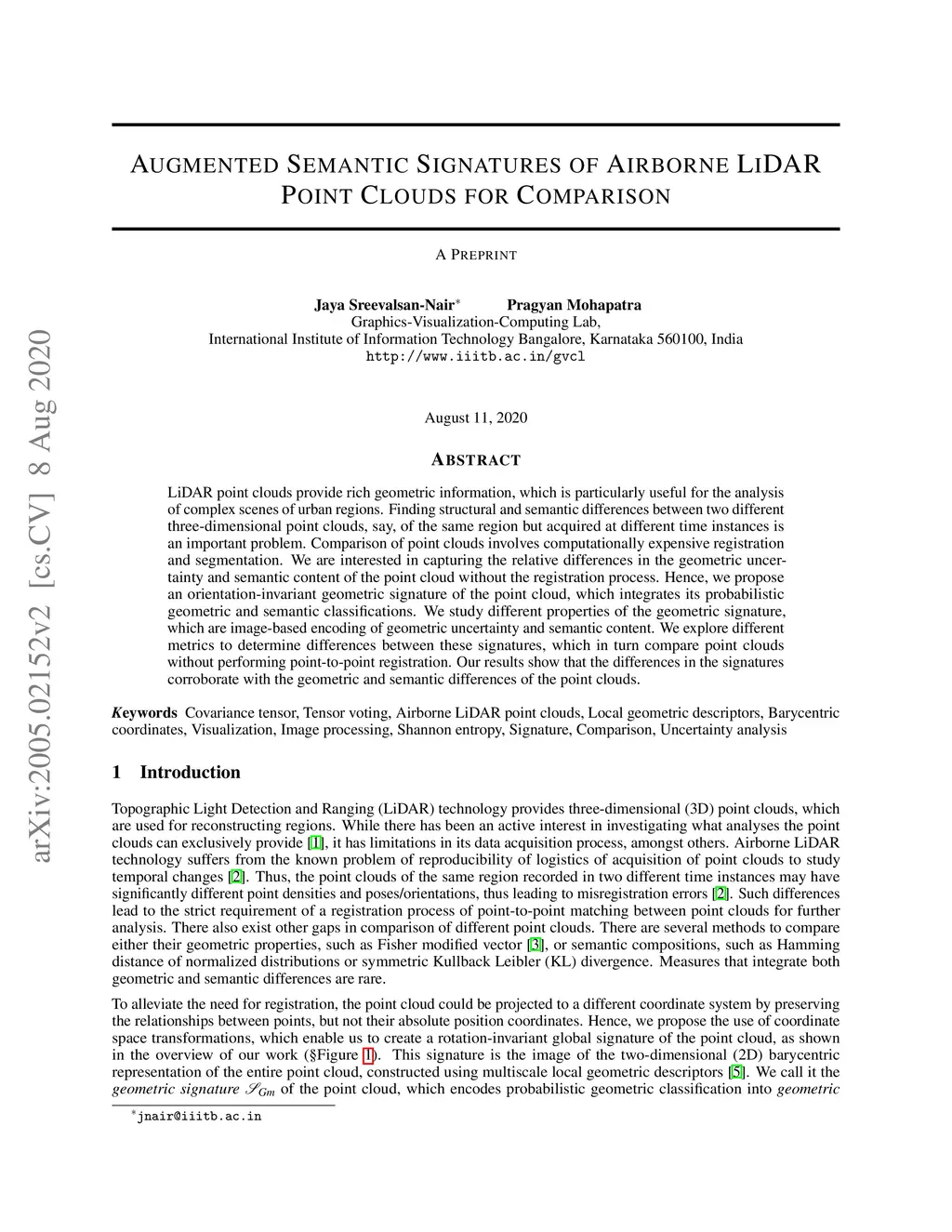 LiDAR point clouds provide rich geometric information, which is particularly useful for the analysis of complex scenes of urban regions. Finding structural and semantic differences between two different three-dimensional point clouds, say, of the same region but acquired at different time instances is an important problem. A comparison of point clouds involves computationally expensive registration and segmentation. We are interested in capturing the relative differences in the geometric uncertainty and semantic content of the point cloud without the registration process. Hence, we propose an orientation-invariant geometric signature of the point cloud, which integrates its probabilistic geometric and semantic classifications. We study different properties of the geometric signature, which are an image-based encoding of geometric uncertainty and semantic content. We explore different metrics to determine differences between these signatures, which in turn compare point clouds without performing point-to-point registration. Our results show that the differences in the signatures corroborate with the geometric and semantic differences of the point clouds.