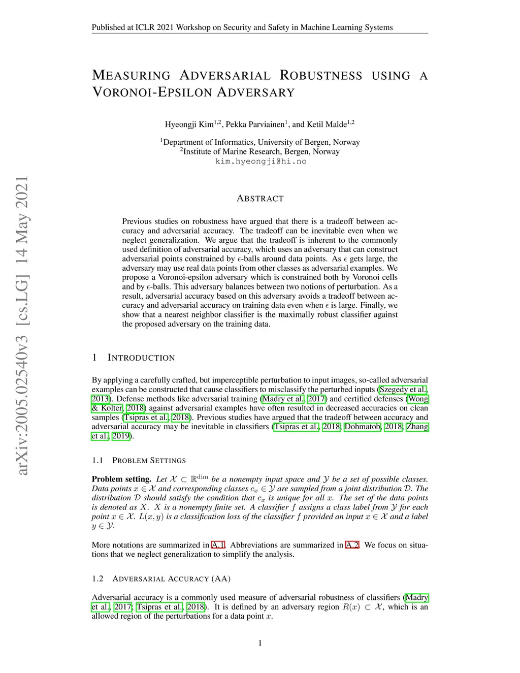 Previous studies on robustness have argued that there is a tradeoff between accuracy and adversarial accuracy. The tradeoff can be inevitable even when we neglect generalization. We argue that the tradeoff is inherent to the commonly used definition of adversarial accuracy, which uses an adversary that can construct adversarial points constrained by -balls around data points. As gets large, the adversary may use real data points from other classes as adversarial examples. We propose a Voronoi-epsilon adversary which is constrained both by Voronoi cells and by -balls. This adversary balances between two notions of perturbation. As a result, adversarial accuracy based on this adversary avoids a tradeoff between accuracy and adversarial accuracy on training data even when is large. Finally, we show that a nearest neighbor classifier is the maximally robust classifier against the proposed adversary on the training data.