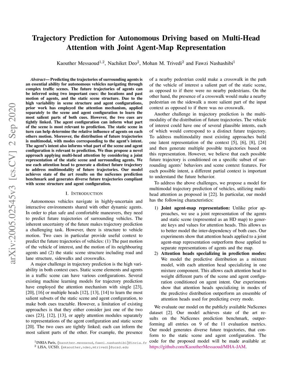 Predicting the trajectories of surrounding agents is an essential ability for autonomous vehicles navigating through complex traffic scenes. The future trajectories of agents can be inferred using two important cues: the locations and past motion of agents, and the static scene structure. Due to the high variability in scene structure and agent configurations, prior work has employed the attention mechanism, applied separately to the scene and agent configuration to learn the most salient parts of both cues. However, the two cues are tightly linked. The agent configuration can inform what part of the scene is most relevant to prediction. The static scene in turn can help determine the relative influence of agents on each other's motion. Moreover, the distribution of future trajectories is multimodal, with modes corresponding to the agent's intent. The agent's intent also informs what part of the scene and agent configuration is relevant to prediction. We thus propose a novel approach applying multi-head attention by considering a joint representation of the static scene and surrounding agents. We use each attention head to generate a distinct future trajectory to address multimodality of future trajectories. Our model achieves state of the art results on the nuScenes prediction benchmark and generates diverse future trajectories compliant with scene structure and agent configuration.