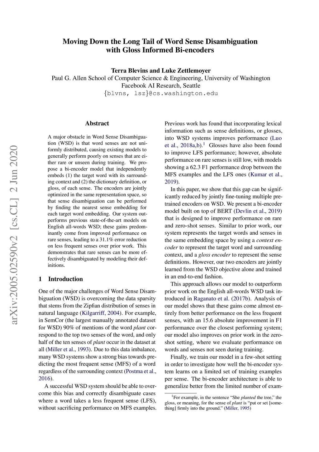 A major obstacle in Word Sense Disambiguation (WSD) is that word senses are not uniformly distributed, causing existing models to generally perform poorly on senses that are either rare or unseen during training. We propose a bi-encoder model that independently embeds (1) the target word with its surrounding context and (2) the dictionary definition, or gloss, of each sense. The encoders are jointly optimized in the same representation space, so that sense disambiguation can be performed by finding the nearest sense embedding for each target word embedding. Our system outperforms previous state-of-the-art models on English all-words WSD; these gains predominantly come from improved performance on rare senses, leading to a 31.1% error reduction on less frequent senses over prior work. This demonstrates that rare senses can be more effectively disambiguated by modeling their definitions.