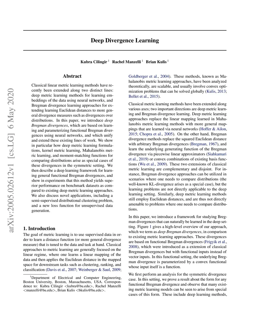 Classical linear metric learning methods have recently been extended along two distinct lines: deep metric learning methods for learning embeddings of the data using neural networks, and Bregman divergence learning approaches for extending learning Euclidean distances to more general divergence measures such as divergences over distributions. In this paper, we introduce deep Bregman divergences, which are based on learning and parameterizing functional Bregman divergences using neural networks, and which unify and extend these existing lines of work. We show in particular how deep metric learning formulations, kernel metric learning, Mahalanobis metric learning, and moment-matching functions for comparing distributions arise as special cases of these divergences in the symmetric setting. We then describe a deep learning framework for learning general functional Bregman divergences, and show in experiments that this method yields superior performance on benchmark datasets as compared to existing deep metric learning approaches. We also discuss novel applications, including a semi-supervised distributional clustering problem, and a new loss function for unsupervised data generation.