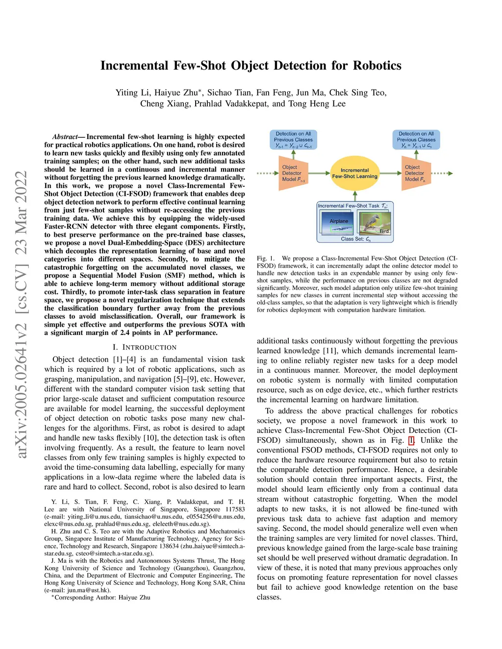 Incremental few-shot learning is highly expected for practical robotics applications. On one hand, robot is desired to learn new tasks quickly and flexibly using only few annotated training samples; on the other hand, such new additional tasks should be learned in a continuous and incremental manner without forgetting the previous learned knowledge dramatically. In this work, we propose a novel Class-Incremental Few-Shot Object Detection (CI-FSOD) framework that enables deep object detection network to perform effective continual learning from just few-shot samples without re-accessing the previous training data. We achieve this by equipping the widely-used Faster-RCNN detector with three elegant components. Firstly, to best preserve performance on the pre-trained base classes, we propose a novel Dual-Embedding-Space (DES) architecture which decouples the representation learning of base and novel categories into different spaces. Secondly, to mitigate the catastrophic forgetting on the accumulated novel classes, we propose a Sequential Model Fusion (SMF) method, which is able to achieve long-term memory without additional storage cost. Thirdly, to promote inter-task class separation in feature space, we propose a novel regularization technique that extends the classification boundary further away from the previous classes to avoid misclassification. Overall, our framework is simple yet effective and outperforms the previous SOTA with a significant margin of 2.4 points in AP performance.