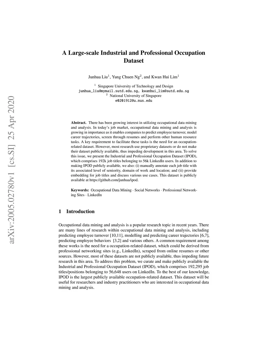 There has been growing interest in utilizing occupational data mining and analysis. In today's job market, occupational data mining and analysis is growing in importance as it enables companies to predict employee turnover, model career trajectories, screen through resumes and perform other human resource tasks. A key requirement to facilitate these tasks is the need for an occupation-related dataset. However, most research use proprietary datasets or do not make their dataset publicly available, thus impeding development in this area. To solve this issue, we present the Industrial and Professional Occupation Dataset (IPOD), which comprises 192k job titles belonging to 56k LinkedIn users. In addition to making IPOD publicly available, we also: (i) manually annotate each job title with its associated level of seniority, domain of work and location; and (ii) provide embedding for job titles and discuss various use cases. This dataset is publicly available at https://github.com/junhua/ipod.
