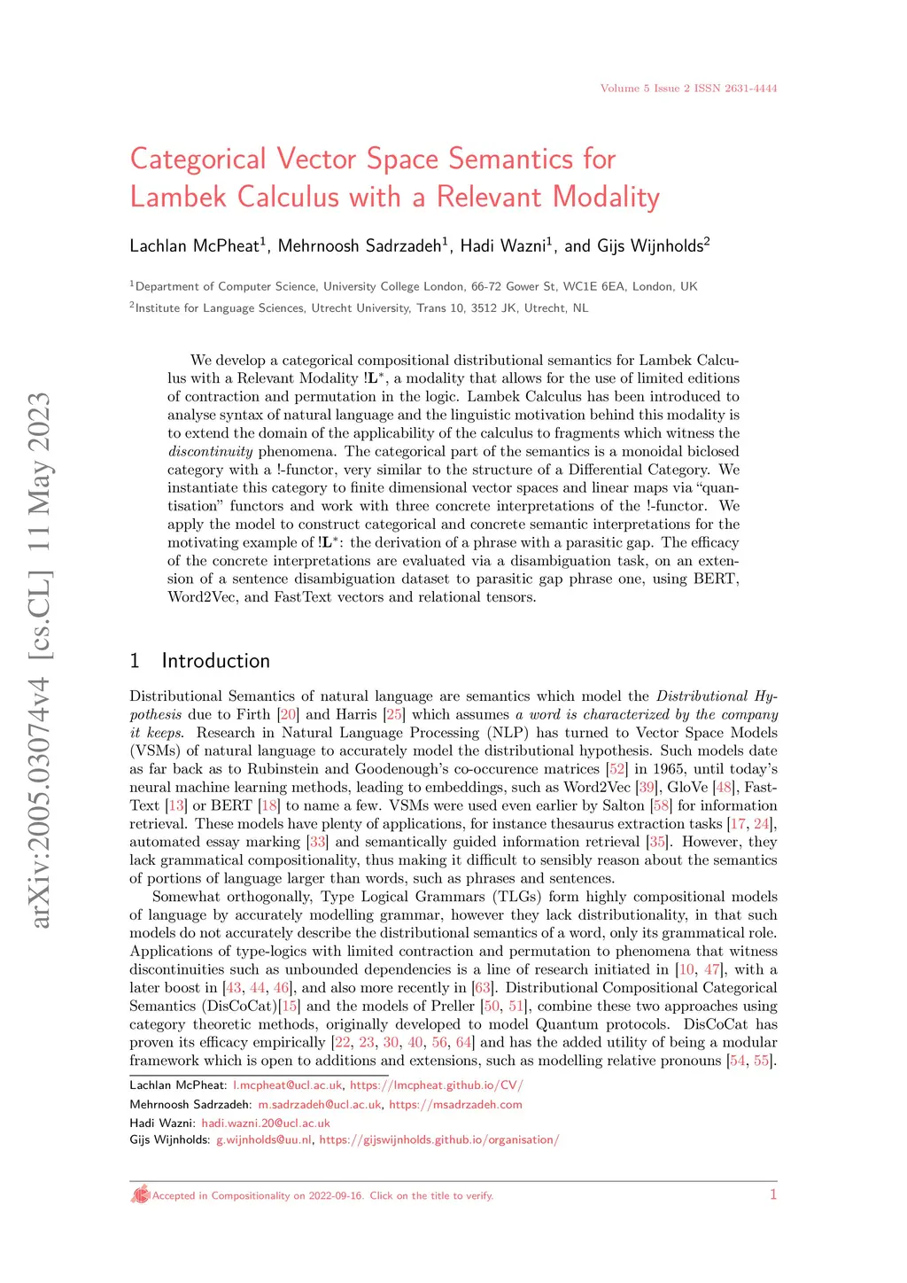 We develop a categorical compositional distributional semantics for Lambek Calculus with a Relevant Modality !L*, which has a limited edition of the contraction and permutation rules. The categorical part of the semantics is a monoidal biclosed category with a coalgebra modality, very similar to the structure of a Differential Category. We instantiate this category to finite dimensional vector spaces and linear maps via "quantisation" functors and work with three concrete interpretations of the coalgebra modality. We apply the model to construct categorical and concrete semantic interpretations for the motivating example of !L*: the derivation of a phrase with a parasitic gap. The effectiveness of the concrete interpretations are evaluated via a disambiguation task, on an extension of a sentence disambiguation dataset to parasitic gap phrases, using BERT, Word2Vec, and FastText vectors and Relational tensors.