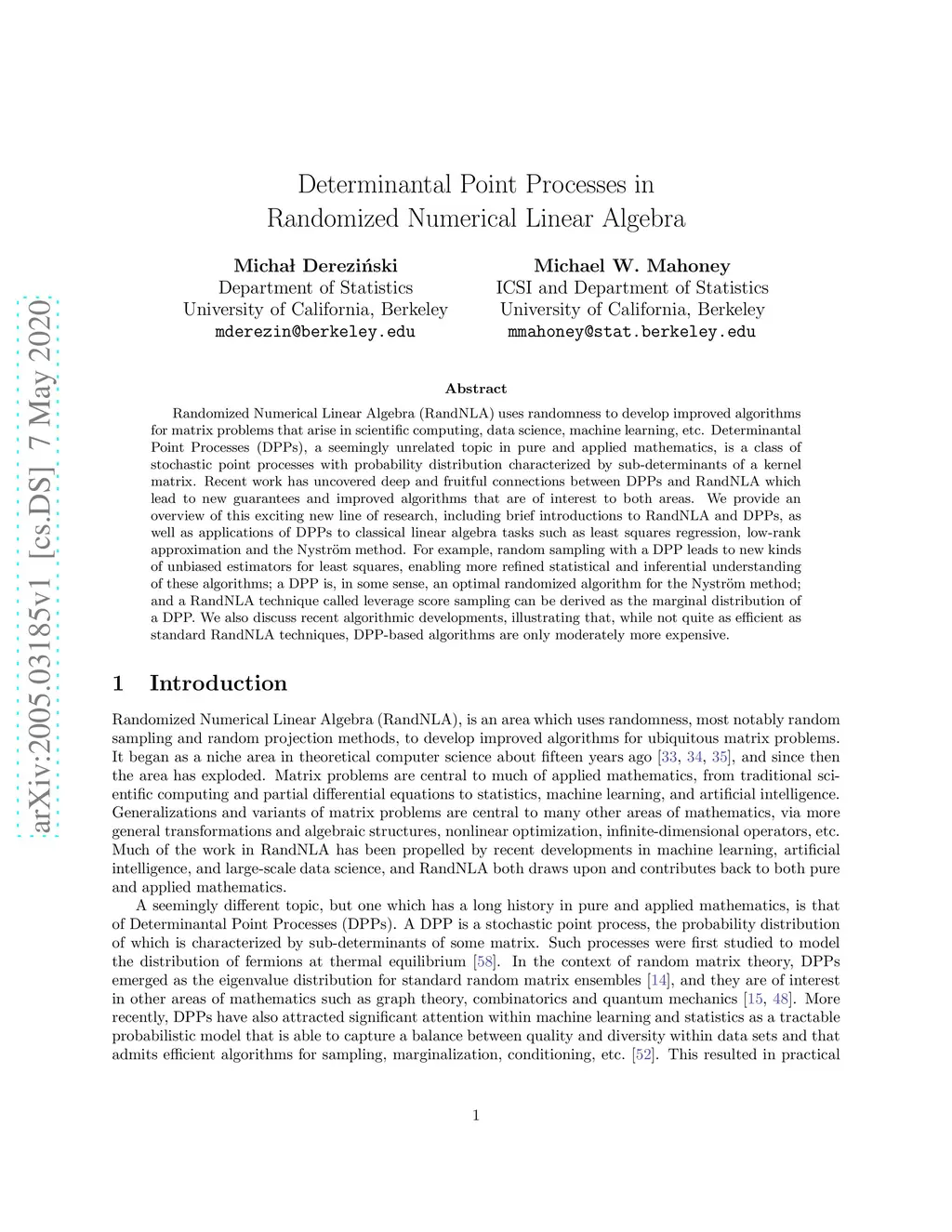 Randomized Numerical Linear Algebra (RandNLA) uses randomness to develop improved algorithms for matrix problems that arise in scientific computing, data science, machine learning, etc. Determinantal Point Processes (DPPs), a seemingly unrelated topic in pure and applied mathematics, is a class of stochastic point processes with probability distribution characterized by sub-determinants of a kernel matrix. Recent work has uncovered deep and fruitful connections between DPPs and RandNLA which lead to new guarantees and improved algorithms that are of interest to both areas. We provide an overview of this exciting new line of research, including brief introductions to RandNLA and DPPs, as well as applications of DPPs to classical linear algebra tasks such as least squares regression, low-rank approximation and the Nystr\"om method. For example, random sampling with a DPP leads to new kinds of unbiased estimators for least squares, enabling more refined statistical and inferential understanding of these algorithms; a DPP is, in some sense, an optimal randomized algorithm for the Nystr\"om method; and a RandNLA technique called leverage score sampling can be derived as the marginal distribution of a DPP. We also discuss recent algorithmic developments, illustrating that, while not quite as efficient as standard RandNLA techniques, DPP-based algorithms are only moderately more expensive.