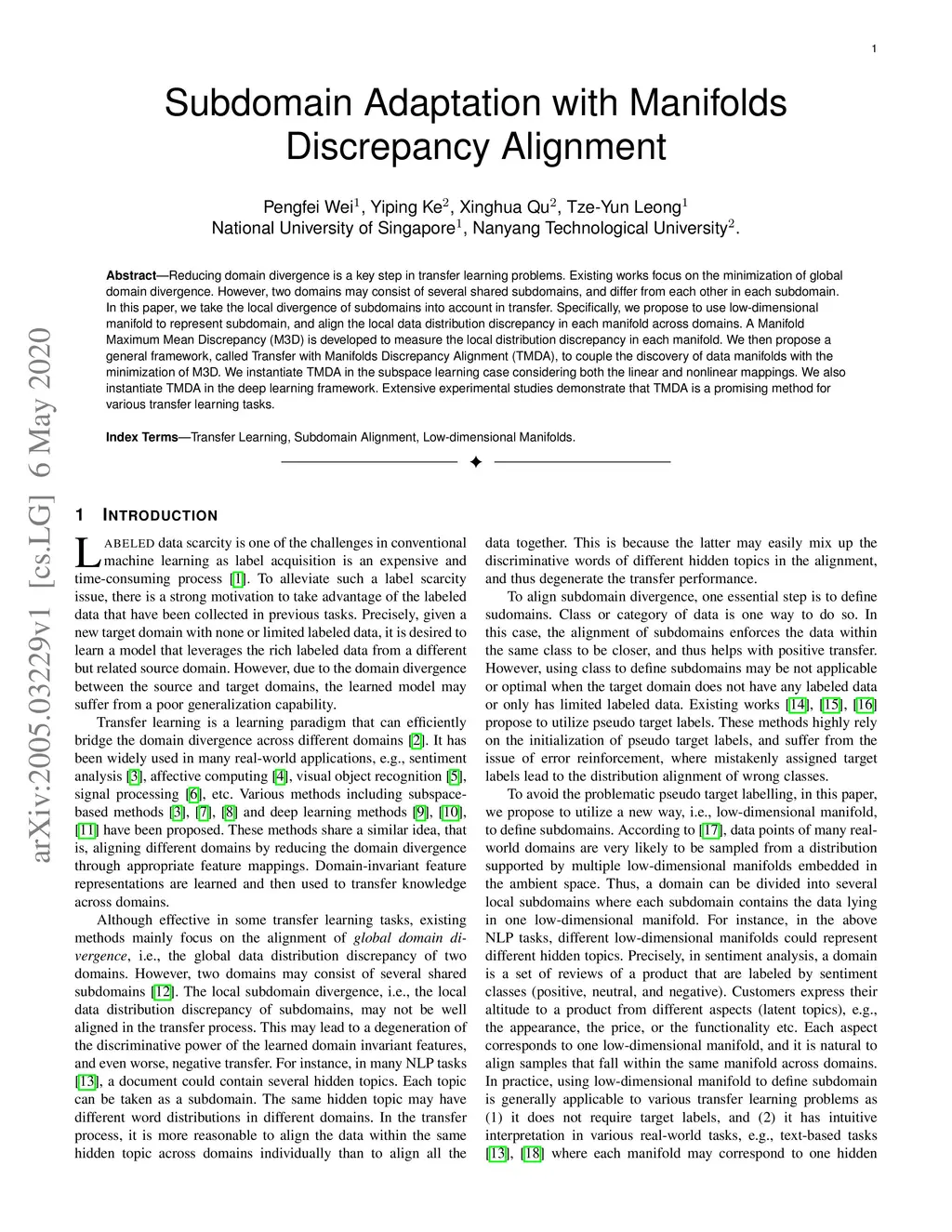 Subdomain Adaptation with Manifolds Discrepancy Alignment