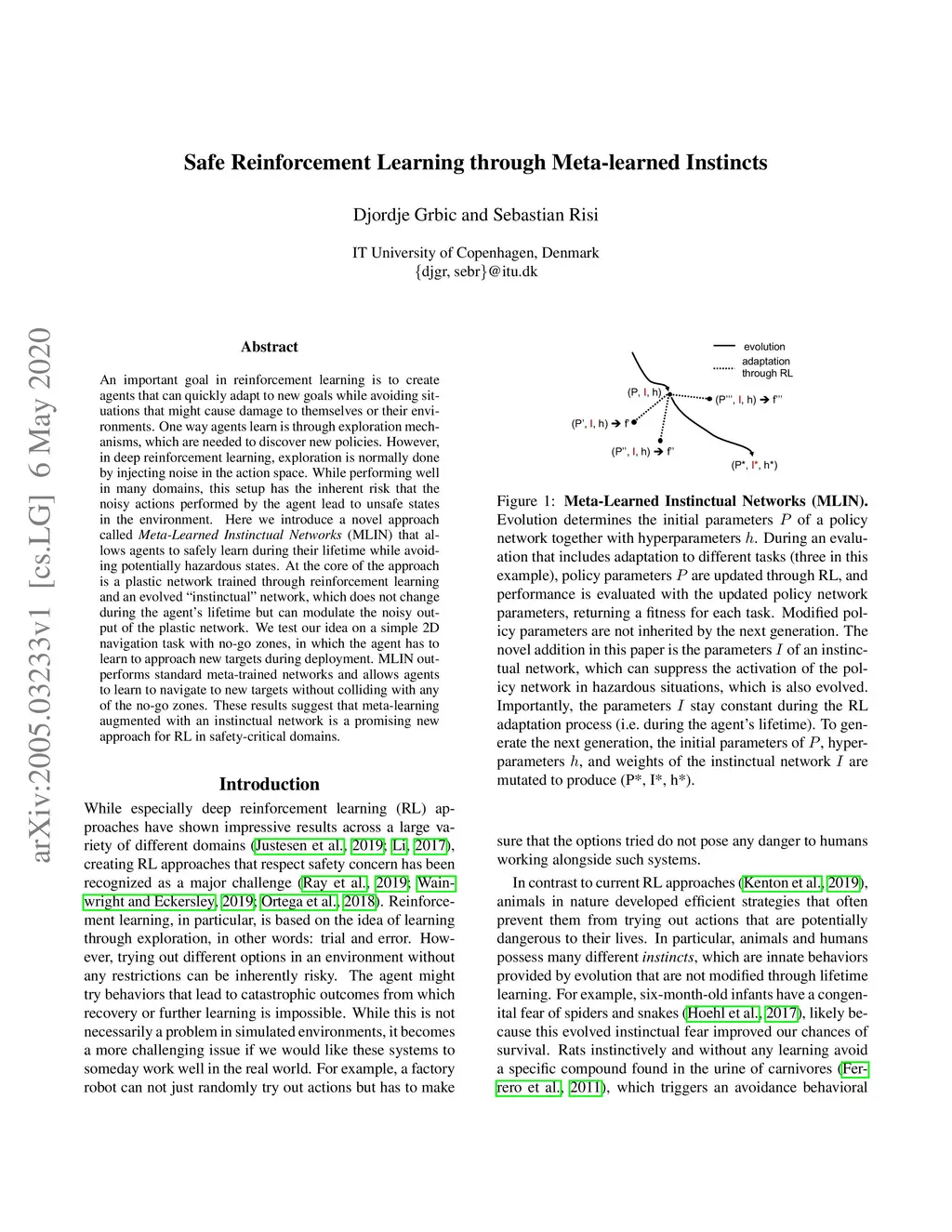 An important goal in reinforcement learning is to create agents that can quickly adapt to new goals while avoiding situations that might cause damage to themselves or their environments. One way agents learn is through exploration mechanisms, which are needed to discover new policies. However, in deep reinforcement learning, exploration is normally done by injecting noise in the action space. While performing well in many domains, this setup has the inherent risk that the noisy actions performed by the agent lead to unsafe states in the environment. Here we introduce a novel approach called Meta-Learned Instinctual Networks (MLIN) that allows agents to safely learn during their lifetime while avoiding potentially hazardous states. At the core of the approach is a plastic network trained through reinforcement learning and an evolved "instinctual" network, which does not change during the agent's lifetime but can modulate the noisy output of the plastic network. We test our idea on a simple 2D navigation task with no-go zones, in which the agent has to learn to approach new targets during deployment. MLIN outperforms standard meta-trained networks and allows agents to learn to navigate to new targets without colliding with any of the no-go zones. These results suggest that meta-learning augmented with an instinctual network is a promising new approach for safe AI, which may enable progress in this area on a variety of different domains.