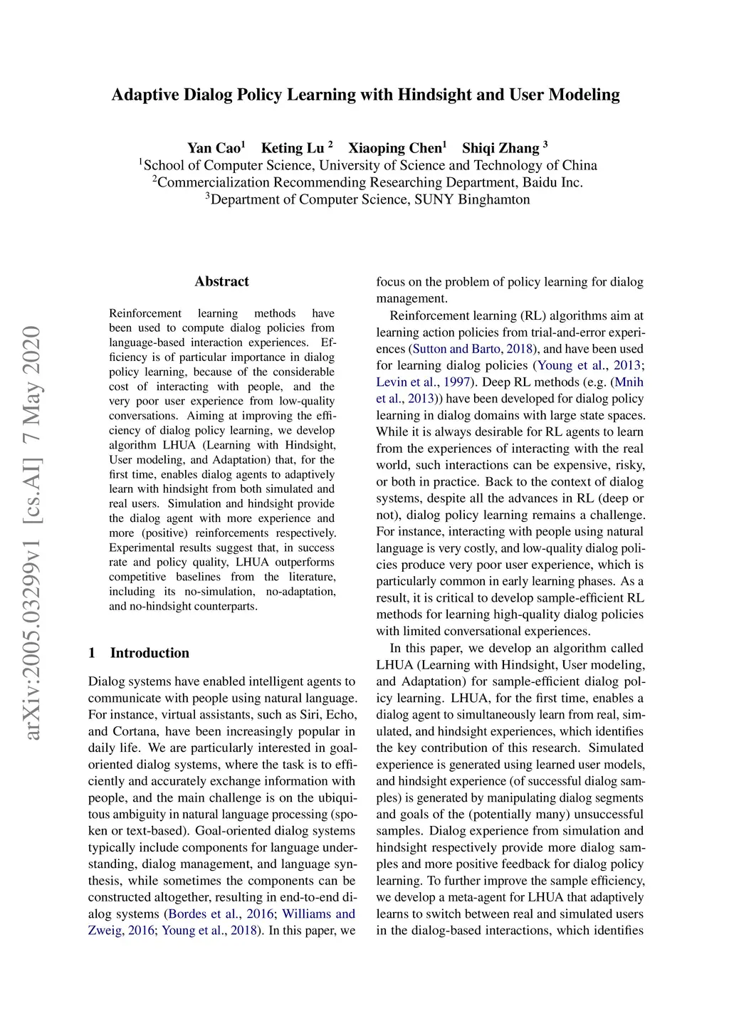 Reinforcement learning methods have been used to compute dialog policies from language-based interaction experiences. Efficiency is of particular importance in dialog policy learning, because of the considerable cost of interacting with people, and the very poor user experience from low-quality conversations. Aiming at improving the efficiency of dialog policy learning, we develop algorithm LHUA (Learning with Hindsight, User modeling, and Adaptation) that, for the first time, enables dialog agents to adaptively learn with hindsight from both simulated and real users. Simulation and hindsight provide the dialog agent with more experience and more (positive) reinforcements respectively. Experimental results suggest that, in success rate and policy quality, LHUA outperforms competitive baselines from the literature, including its no-simulation, no-adaptation, and no-hindsight counterparts.