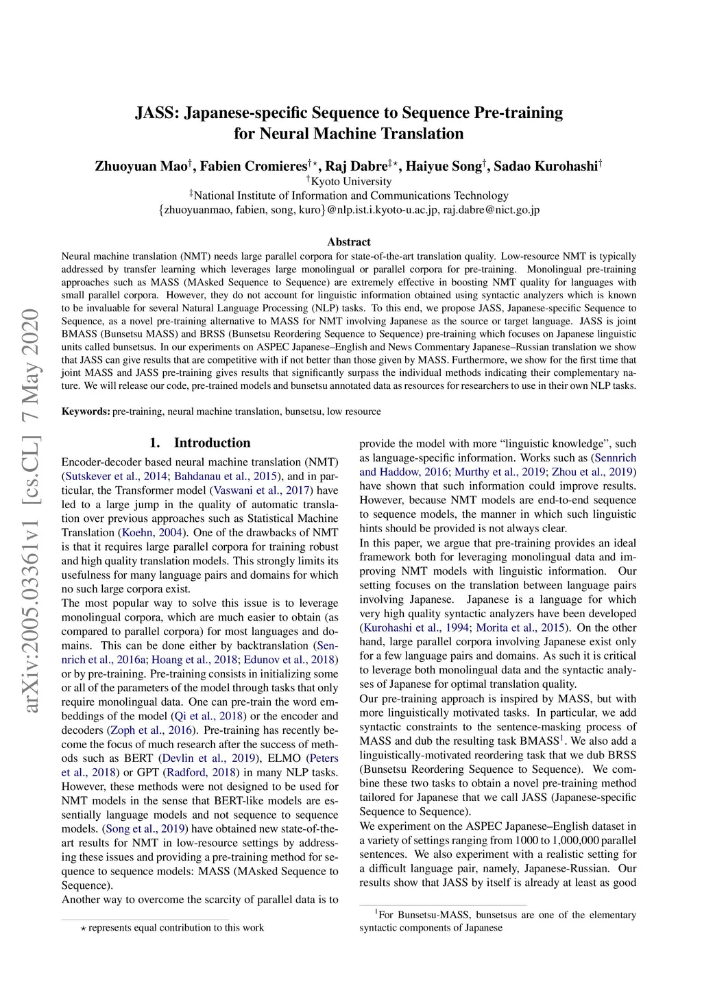 Neural machine translation (NMT) needs large parallel corpora for state-of-the-art translation quality. Low-resource NMT is typically addressed by transfer learning which leverages large monolingual or parallel corpora for pre-training. Monolingual pre-training approaches such as MASS (MAsked Sequence to Sequence) are extremely effective in boosting NMT quality for languages with small parallel corpora. However, they do not account for linguistic information obtained using syntactic analyzers which is known to be invaluable for several Natural Language Processing (NLP) tasks. To this end, we propose JASS, Japanese-specific Sequence to Sequence, as a novel pre-training alternative to MASS for NMT involving Japanese as the source or target language. JASS is joint BMASS (Bunsetsu MASS) and BRSS (Bunsetsu Reordering Sequence to Sequence) pre-training which focuses on Japanese linguistic units called bunsetsus. In our experiments on ASPEC Japanese--English and News Commentary Japanese--Russian translation we show that JASS can give results that are competitive with if not better than those given by MASS. Furthermore, we show for the first time that joint MASS and JASS pre-training gives results that significantly surpass the individual methods indicating their complementary nature. We will release our code, pre-trained models and bunsetsu annotated data as resources for researchers to use in their own NLP tasks.