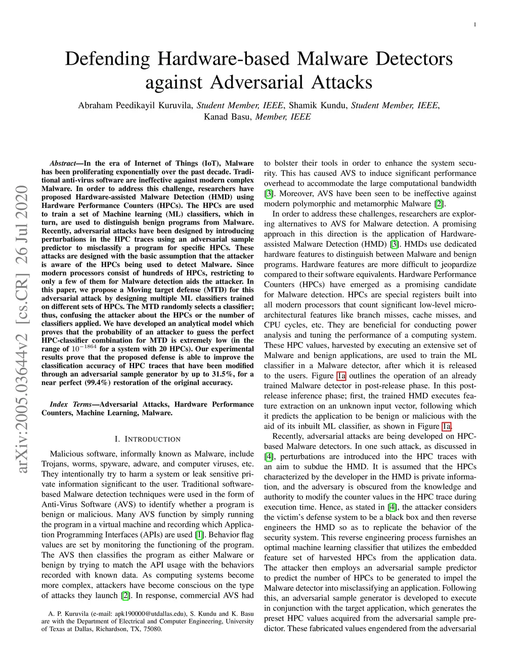 In the era of Internet of Things (IoT), Malware has been proliferating exponentially over the past decade. Traditional anti-virus software are ineffective against modern complex Malware. In order to address this challenge, researchers have proposed Hardware-assisted Malware Detection (HMD) using Hardware Performance Counters (HPCs). The HPCs are used to train a set of Machine learning (ML) classifiers, which in turn, are used to distinguish benign programs from Malware. Recently, adversarial attacks have been designed by introducing perturbations in the HPC traces using an adversarial sample predictor to misclassify a program for specific HPCs. These attacks are designed with the basic assumption that the attacker is aware of the HPCs being used to detect Malware. Since modern processors consist of hundreds of HPCs, restricting to only a few of them for Malware detection aids the attacker. In this paper, we propose a Moving target defense (MTD) for this adversarial attack by designing multiple ML classifiers trained on different sets of HPCs. The MTD randomly selects a classifier; thus, confusing the attacker about the HPCs or the number of classifiers applied. We have developed an analytical model which proves that the probability of an attacker to guess the perfect HPC-classifier combination for MTD is extremely low (in the range of for a system with 20 HPCs). Our experimental results prove that the proposed defense is able to improve the classification accuracy of HPC traces that have been modified through an adversarial sample generator by up to 31.5%, for a near perfect (99.4%) restoration of the original accuracy.