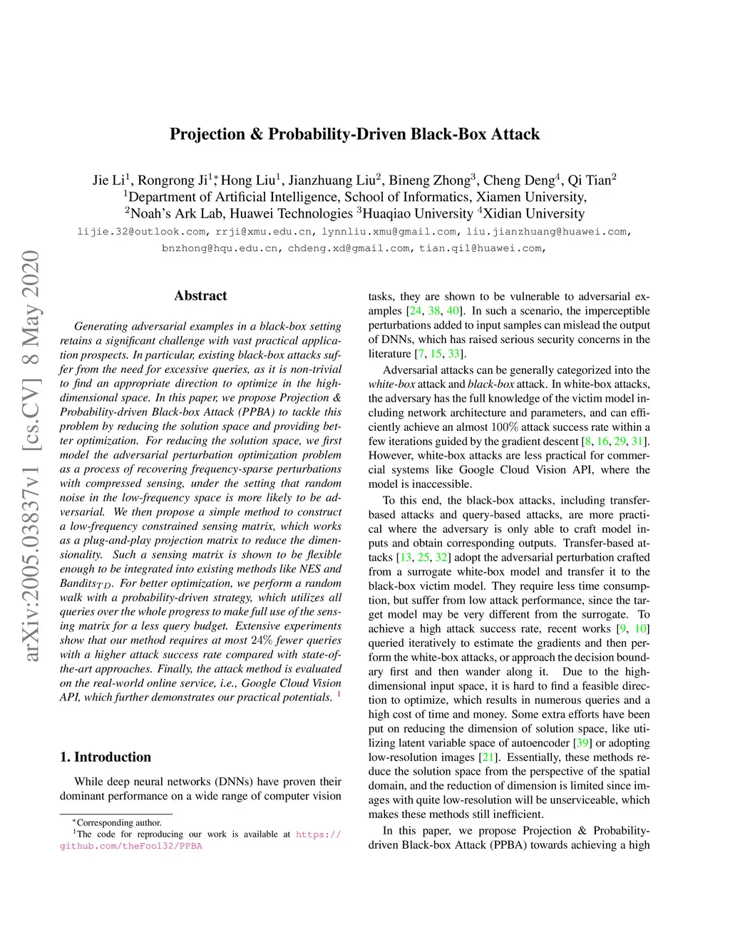 Generating adversarial examples in a black-box setting retains a significant challenge with vast practical application prospects. In particular, existing black-box attacks suffer from the need for excessive queries, as it is non-trivial to find an appropriate direction to optimize in the high-dimensional space. In this paper, we propose Projection & Probability-driven Black-box Attack (PPBA) to tackle this problem by reducing the solution space and providing better optimization. For reducing the solution space, we first model the adversarial perturbation optimization problem as a process of recovering frequency-sparse perturbations with compressed sensing, under the setting that random noise in the low-frequency space is more likely to be adversarial. We then propose a simple method to construct a low-frequency constrained sensing matrix, which works as a plug-and-play projection matrix to reduce the dimensionality. Such a sensing matrix is shown to be flexible enough to be integrated into existing methods like NES and Bandits. For better optimization, we perform a random walk with a probability-driven strategy, which utilizes all queries over the whole progress to make full use of the sensing matrix for a less query budget. Extensive experiments show that our method requires at most 24% fewer queries with a higher attack success rate compared with state-of-the-art approaches. Finally, the attack method is evaluated on the real-world online service, i.e., Google Cloud Vision API, which further demonstrates our practical potentials.