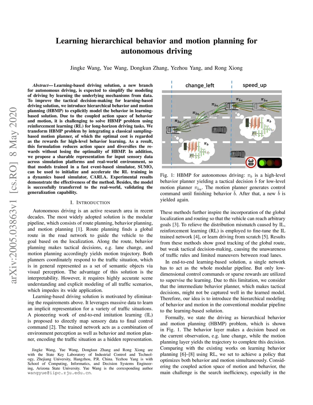 Learning-based driving solution, a new branch for autonomous driving, is expected to simplify the modeling of driving by learning the underlying mechanisms from data. To improve the tactical decision-making for learning-based driving solution, we introduce hierarchical behavior and motion planning (HBMP) to explicitly model the behavior in learning-based solution. Due to the coupled action space of behavior and motion, it is challenging to solve HBMP problem using reinforcement learning (RL) for long-horizon driving tasks. We transform HBMP problem by integrating a classical sampling-based motion planner, of which the optimal cost is regarded as the rewards for high-level behavior learning. As a result, this formulation reduces action space and diversifies the rewards without losing the optimality of HBMP. In addition, we propose a sharable representation for input sensory data across simulation platforms and real-world environment, so that models trained in a fast event-based simulator, SUMO, can be used to initialize and accelerate the RL training in a dynamics based simulator, CARLA. Experimental results demonstrate the effectiveness of the method. Besides, the model is successfully transferred to the real-world, validating the generalization capability.