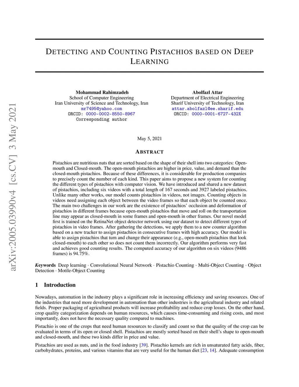 Pistachios are nutritious nuts that are sorted based on the shape of their shell into two categories: Open-mouth and Closed-mouth. The open-mouth pistachios are higher in price, value, and demand than the closed-mouth pistachios. Because of these differences, it is considerable for production companies to precisely count the number of each kind. This paper aims to propose a new system for counting the different types of pistachios with computer vision. We have introduced and shared a new dataset of pistachios, including six videos with a total length of 167 seconds and 3927 labeled pistachios. Unlike many other works, our model counts pistachios in videos, not images. Counting objects in videos need assigning each object between the video frames so that each object be counted once. The main two challenges in our work are the existence of pistachios' occlusion and deformation of pistachios in different frames because open-mouth pistachios that move and roll on the transportation line may appear as closed-mouth in some frames and open-mouth in other frames. Our novel model first is trained on the RetinaNet object detector network using our dataset to detect different types of pistachios in video frames. After gathering the detections, we apply them to a new counter algorithm based on a new tracker to assign pistachios in consecutive frames with high accuracy. Our model is able to assign pistachios that turn and change their appearance (e.g., open-mouth pistachios that look closed-mouth) to each other so does not count them incorrectly. Our algorithm performs very fast and achieves good counting results. The computed accuracy of our algorithm on six videos (9486 frames) is 94.75%.