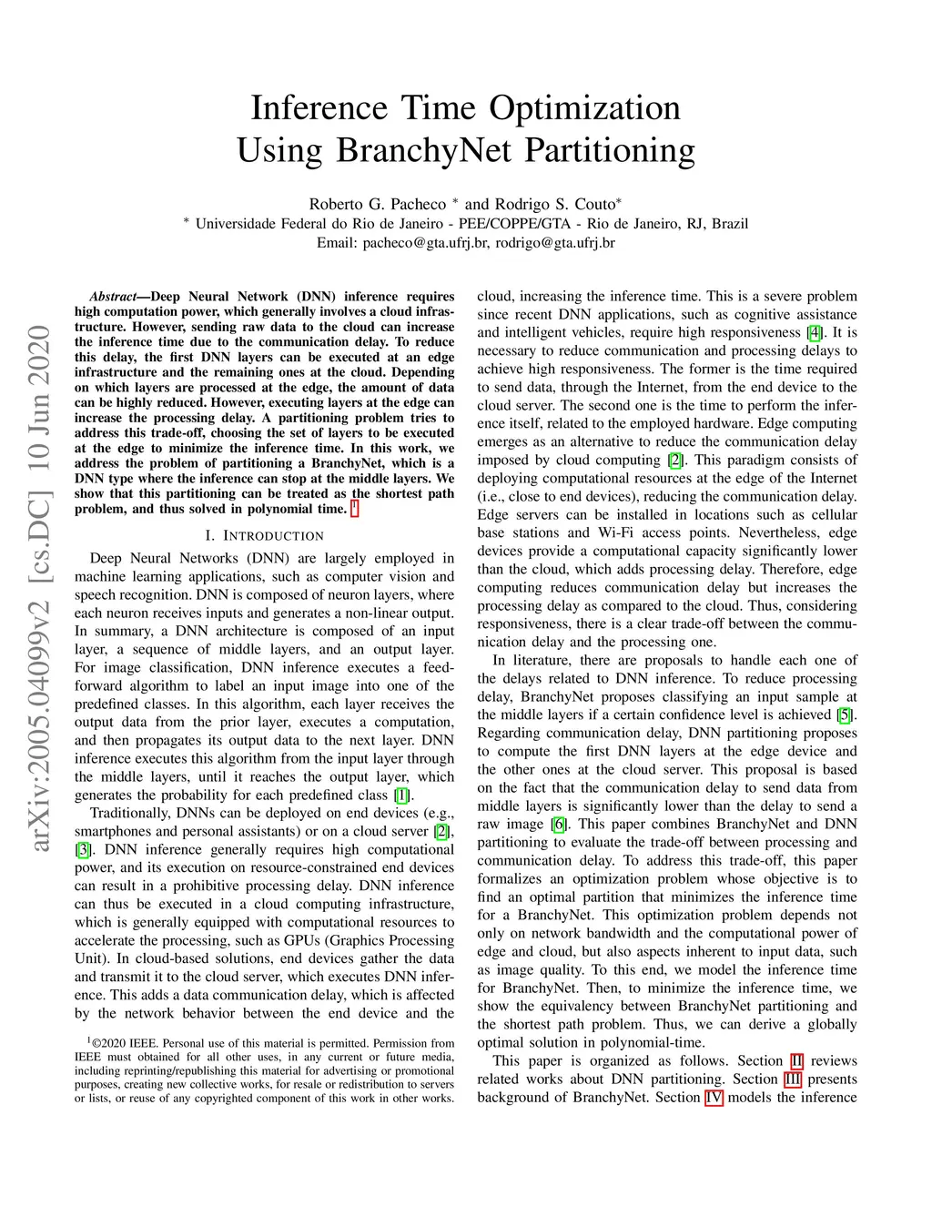 Deep Neural Network (DNN) applications with edge computing presents a trade-off between responsiveness and computational resources. On one hand, edge computing can provide high responsiveness deploying computational resources close to end devices, which may be prohibitive for the majority of cloud computing services. On the other hand, DNN inference requires computational power to be executed, which may not be available on edge devices, but a cloud server can provide it. To solve this problem (trade-off), we partition a DNN between edge device and cloud server, which means the first DNN layers are processed at the edge and the other layers at the cloud. This paper proposes an optimal partition of DNN, according to network bandwidth, computational resources of edge and cloud, and parameter inherent to data. Our proposal aims to minimize the inference time, to allow high responsiveness applications. To this end, we show the equivalency between DNN partitioning problem and shortest path problem to find an optimal solution, using Dijkstra's algorithm.