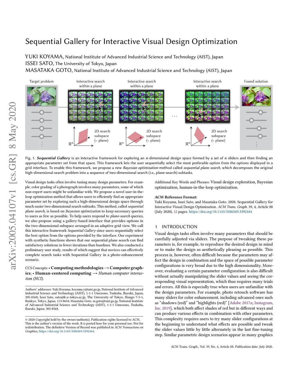 Visual design tasks often involve tuning many design parameters. For example, color grading of a photograph involves many parameters, some of which non-expert users might be unfamiliar with. We propose a novel user-in-the-loop optimization method that allows users to efficiently find an appropriate parameter set by exploring such a high-dimensional design space through much easier two-dimensional search subtasks. This method, called sequential plane search, is based on Bayesian optimization to keep necessary queries to users as few as possible. To help users respond to plane-search queries, we also propose using a gallery-based interface that provides options in the two-dimensional subspace arranged in an adaptive grid view. We call this interactive framework Sequential Gallery since users sequentially select the best option from the options provided by the interface. Our experiment with synthetic functions shows that our sequential plane search can find satisfactory solutions in fewer iterations than baselines. We also conducted a preliminary user study, results of which suggest that novices can effectively complete search tasks with Sequential Gallery in a photo-enhancement scenario.