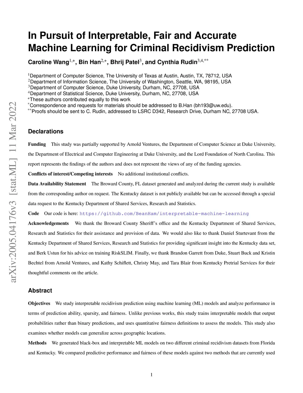 Objectives: We study interpretable recidivism prediction using machine learning (ML) models and analyze performance in terms of prediction ability, sparsity, and fairness. Unlike previous works, this study trains interpretable models that output probabilities rather than binary predictions, and uses quantitative fairness definitions to assess the models. This study also examines whether models can generalize across geographic locations. Methods: We generated black-box and interpretable ML models on two different criminal recidivism datasets from Florida and Kentucky. We compared predictive performance and fairness of these models against two methods that are currently used in the justice system to predict pretrial recidivism: the Arnold PSA and COMPAS. We evaluated predictive performance of all models on predicting six different types of crime over two time spans. Results: Several interpretable ML models can predict recidivism as well as black-box ML models and are more accurate than COMPAS or the Arnold PSA. These models are potentially useful in practice. Similar to the Arnold PSA, some of these interpretable models can be written down as a simple table. Others can be displayed using a set of visualizations. Our geographic analysis indicates that ML models should be trained separately for separate locations and updated over time. We also present a fairness analysis for the interpretable models. Conclusions: Interpretable machine learning models can perform just as well as non-interpretable methods and currently-used risk assessment scales, in terms of both prediction accuracy and fairness. Machine learning models might be more accurate when trained separately for distinct locations and kept up-to-date.