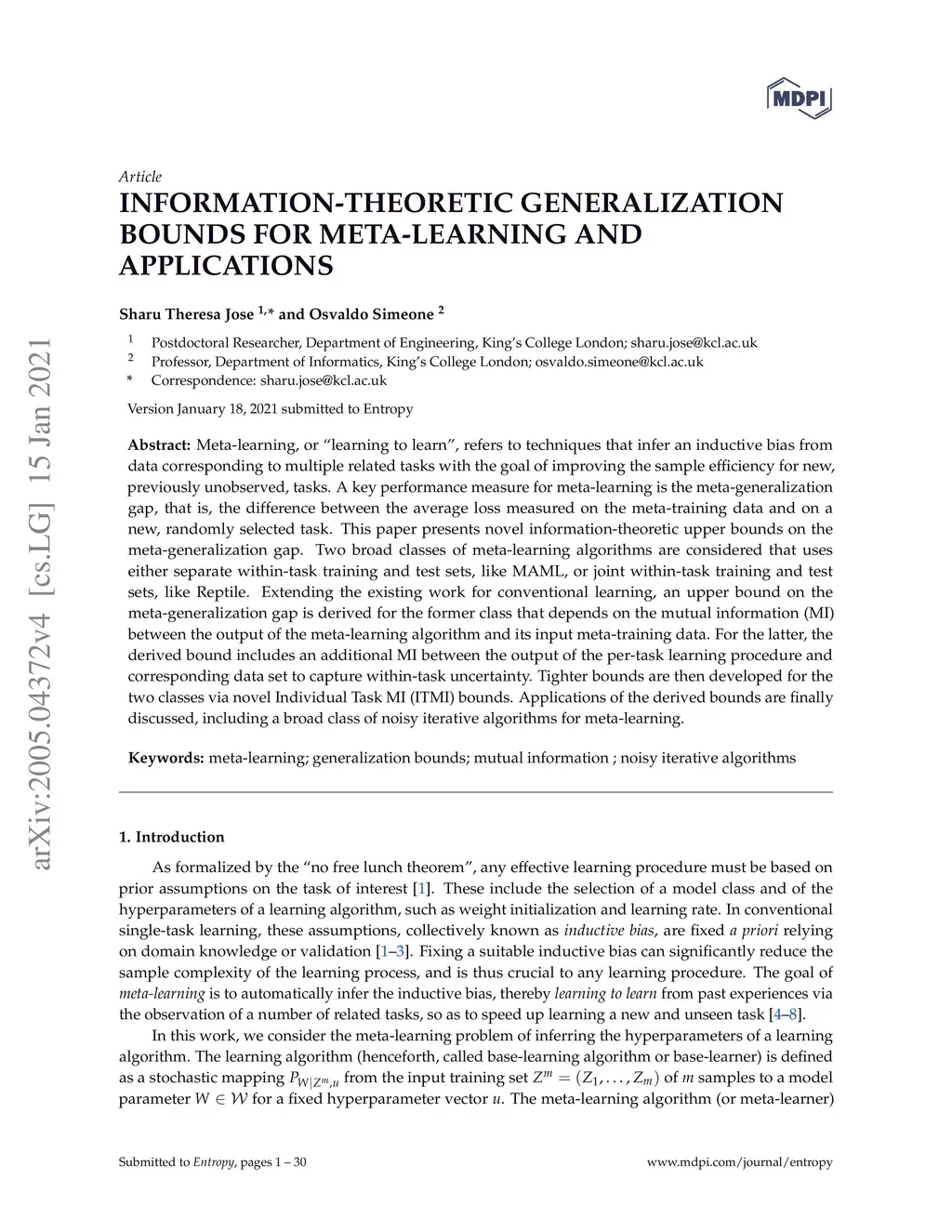 Information-Theoretic Generalization Bounds for Meta-Learning and