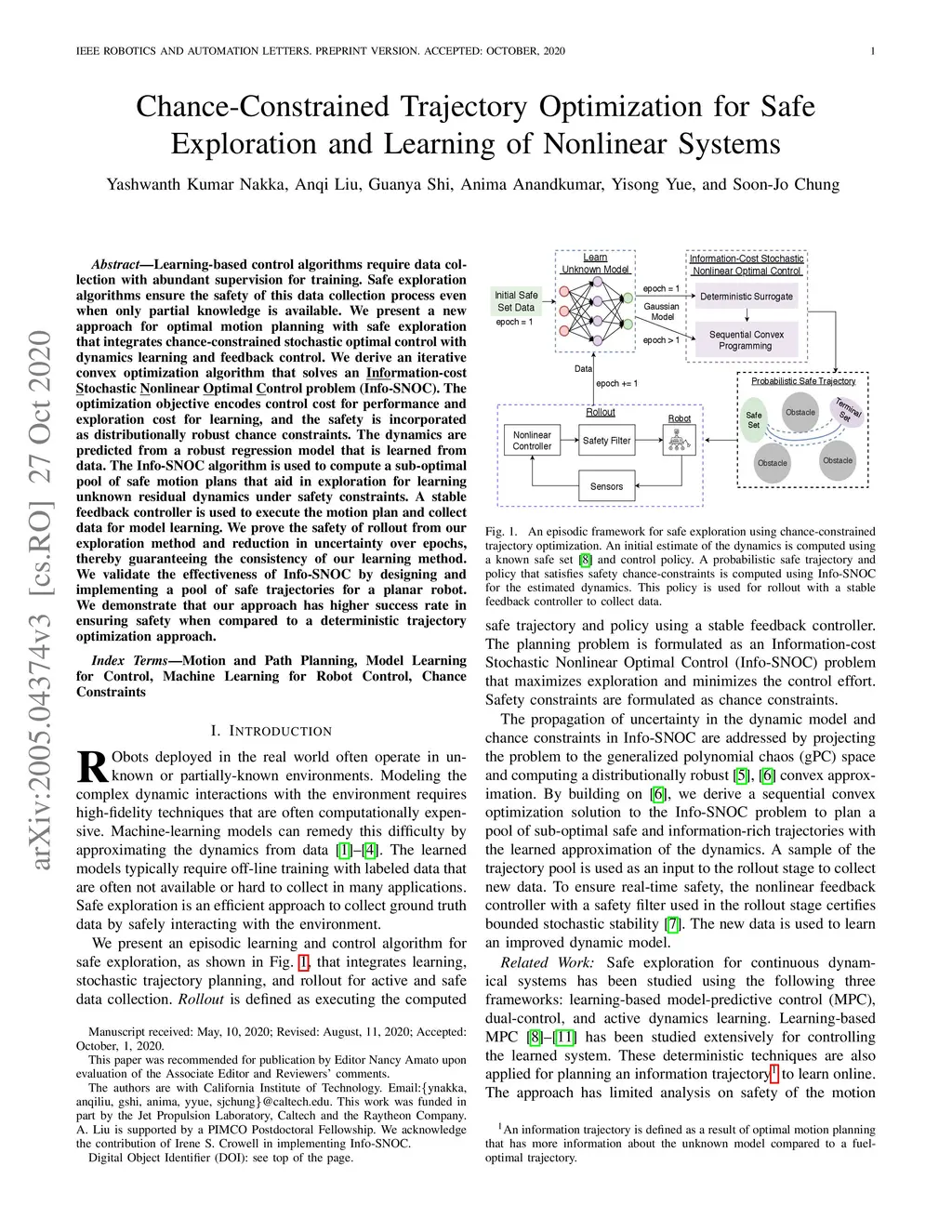 Learning-based control algorithms require data collection with abundant supervision for training. Safe exploration algorithms ensure the safety of this data collection process even when only partial knowledge is available. We present a new approach for optimal motion planning with safe exploration that integrates chance-constrained stochastic optimal control with dynamics learning and feedback control. We derive an iterative convex optimization algorithm that solves an \underline{Info}rmation-cost \underline{S}tochastic \underline{N}onlinear \underline{O}ptimal \underline{C}ontrol problem (Info-SNOC). The optimization objective encodes control cost for performance and exploration cost for learning, and the safety is incorporated as distributionally robust chance constraints. The dynamics are predicted from a robust regression model that is learned from data. The Info-SNOC algorithm is used to compute a sub-optimal pool of safe motion plans that aid in exploration for learning unknown residual dynamics under safety constraints. A stable feedback controller is used to execute the motion plan and collect data for model learning. We prove the safety of rollout from our exploration method and reduction in uncertainty over epochs, thereby guaranteeing the consistency of our learning method. We validate the effectiveness of Info-SNOC by designing and implementing a pool of safe trajectories for a planar robot. We demonstrate that our approach has higher success rate in ensuring safety when compared to a deterministic trajectory optimization approach.