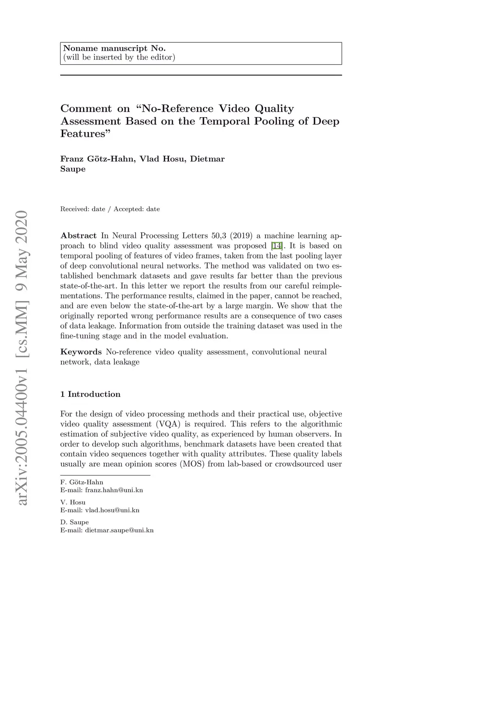 In Neural Processing Letters 50,3 (2019) a machine learning approach to blind video quality assessment was proposed. It is based on temporal pooling of features of video frames, taken from the last pooling layer of deep convolutional neural networks. The method was validated on two established benchmark datasets and gave results far better than the previous state-of-the-art. In this letter we report the results from our careful reimplementations. The performance results, claimed in the paper, cannot be reached, and are even below the state-of-the-art by a large margin. We show that the originally reported wrong performance results are a consequence of two cases of data leakage. Information from outside the training dataset was used in the fine-tuning stage and in the model evaluation.