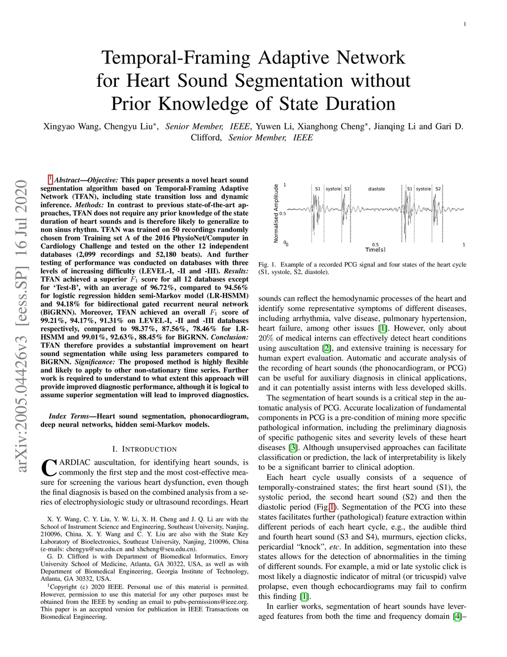 Objective: This paper presents a novel heart sound segmentation algorithm based on Temporal-Framing Adaptive Network (TFAN), including state transition loss and dynamic inference for decoding the most likely state sequence. Methods: In contrast to previous state-of-the-art approaches, the TFAN-based method does not require any knowledge of the state duration of heart sounds and is therefore likely to generalize to non sinus rhythm. The TFAN-based method was trained on 50 recordings randomly chosen from Training set A of the 2016 PhysioNet/Computer in Cardiology Challenge and tested on the other 12 independent training and test databases (2099 recordings and 52180 beats). The databases for segmentation were separated into three levels of increasing difficulty (LEVEL-I, -II and -III) for performance reporting. Results: The TFAN-based method achieved a superior F1 score for all 12 databases except for `Test-B', with an average of 96.7%, compared to 94.6% for the state-of-the-art method. Moreover, the TFAN-based method achieved an overall F1 score of 99.2%, 94.4%, 91.4% on LEVEL-I, -II and -III data respectively, compared to 98.4%, 88.54% and 79.80% for the current state-of-the-art method. Conclusion: The TFAN-based method therefore provides a substantial improvement, particularly for more difficult cases, and on data sets not represented in the public training data. Significance: The proposed method is highly flexible and likely to apply to other non-stationary time series. Further work is required to understand to what extent this approach will provide improved diagnostic performance, although it is logical to assume superior segmentation will lead to improved diagnostics.